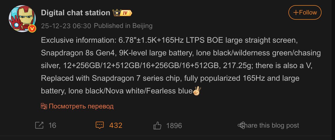 Инсайдер Digital Chat Station предоставил дополнительные сведения о дисплее и автономности устройства. По его информации, смартфон получит плоский 6,78-дюймовый LTPS OLED-экран от компании BOE с разрешением 1.5K и частотой обновления 165 Гц. Емкость аккумулятора составит около 9000 мАч, при этом вес аппарата заявлен на уровне 217,25 грамма.