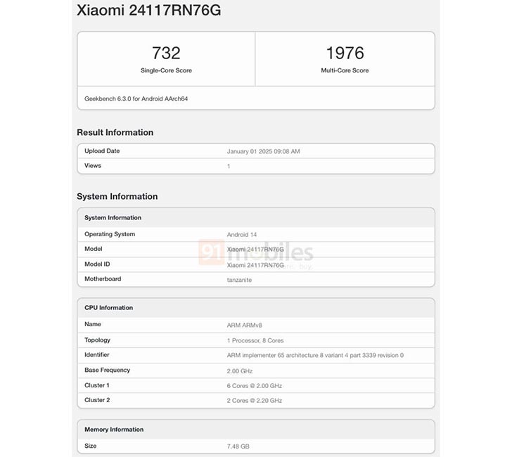 По данным Geekbench, одноядерный результат составил 732, а многоядерный — 1976.