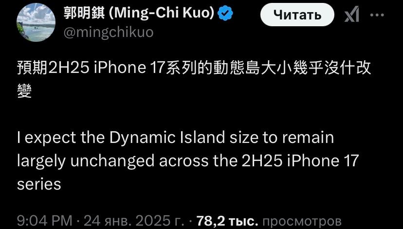 По мнению аналитика Минг-Чи Куо, который поделился прогнозами относительно предстоящей линейки iPhone 17, Dynamic Island будет практически такой же, как и в текущих смартфонах. Предполагается, что «Динамический остров» сохранит свой нынешний внешний вид.
