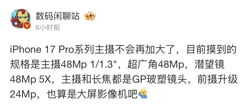 Однако, хотя компания и меняет дизайн камеры, каких- то капитальных изменений в серии iPhone 17 Pro не предвидится. Согласно утечке информации от технологического инсайдера Digital Chat Station (DCS), Apple, скорее всего, будет придерживаться той же системы камер, которая дебютировала в серии iPhone 16 Pro.