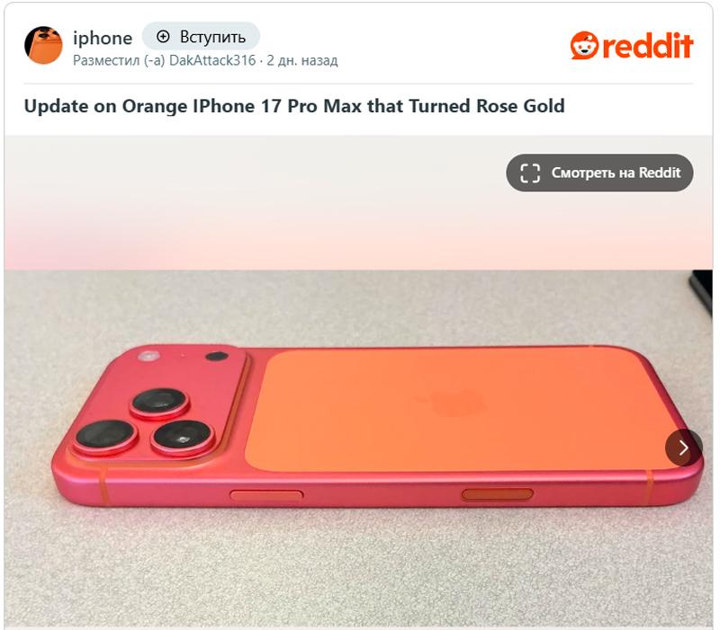 Владелец iPhone 17 Pro Max пожаловался, что его оранжевый смартфон самопроизвольно сменил цвет на розовый