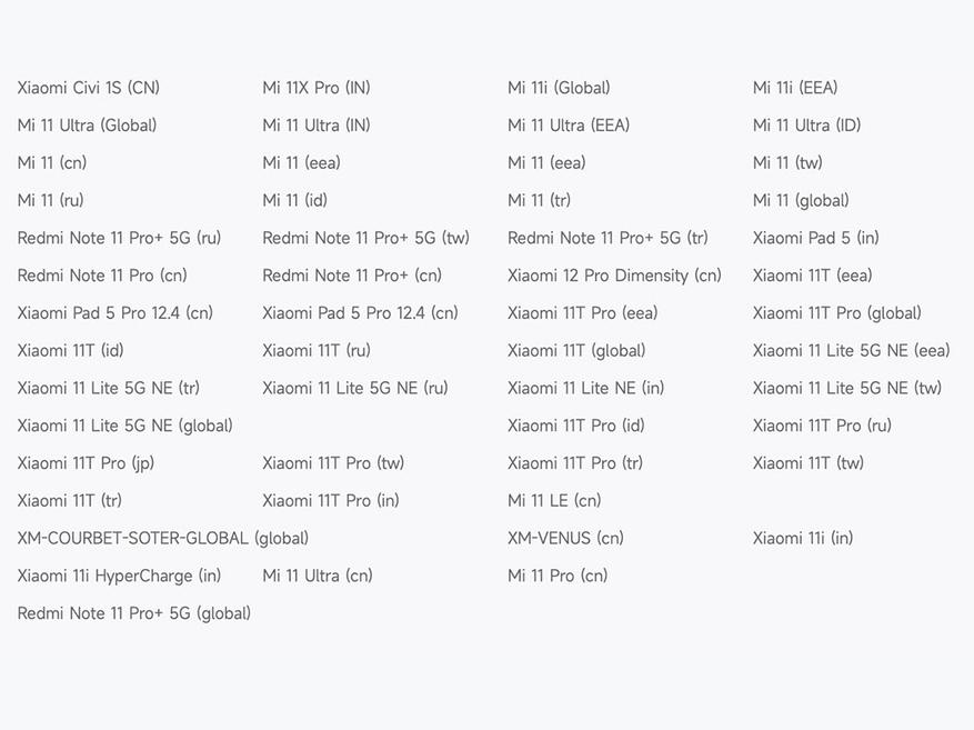 Большинство смартфонов из списка было выпущено в 2021 году. Так, выход обновлений был прекращен для флагманов 11-го поколения (включая версии Lite и Ultra), линейки Xiaomi 11T, а также для старших моделей серии Redmi Note 11. Кроме этого, в перечне оказались планшеты из линейки Pad 5, а также аппарат 2022 года выпуска Xiaomi 12 Pro Dimensity, поддержку которого почему-то не смогли продлить на ещё один год.