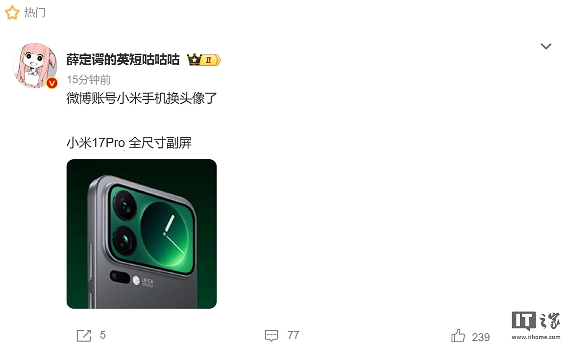 Сегодня официальный аккаунт Xiaomi Mobile в китайской социальной сети Weibo ненадолго обновил свой аватар, непреднамеренно показав неанонсированный смартфон, который, по информации из отраслевых источников, относится к готовящейся серии Xiaomi 17 Pro.