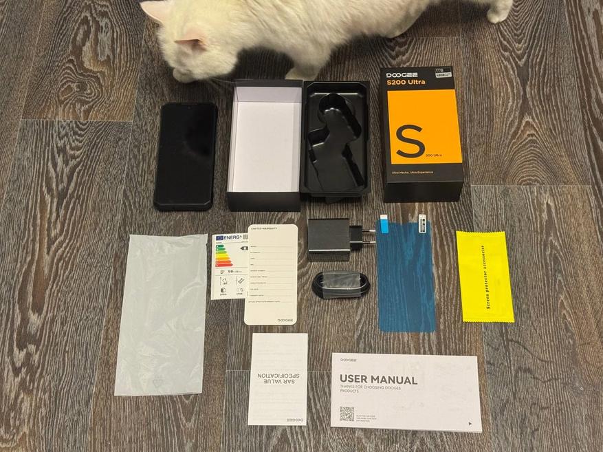 Внутри нас ждёт сам смартфон, быстрая зарядка на 66 Вт, кабель USB-C на USB-C, спиртовые салфетки для протирки, а также инструкция и Quick Guide. А под пластиковой ванночкой можно найти еще и дополнительную защитную пленку на экран, «юзер мануал» и гарантийную карточку. Котейка сразу заинтересовалась комплектом.