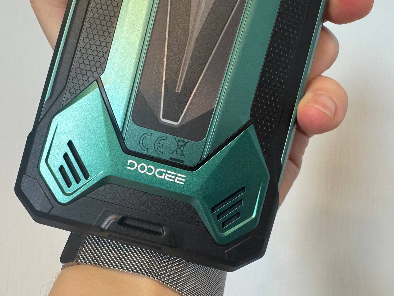Сверху смартфон полностью защищён жёстким пружинящим пластиком. Снизу под заглушкой располагается разъём USB-C для быстрой зарядки, который также может отдавать до 10 Вт, и основной микрофон. В нижней части задней крышки — две решётки, под одной из которых расположен динамик. Звук монофонический, но ощущается достаточно громко. Под динамиком и фальш решеткой достаточно широкое ушко для ремешка.