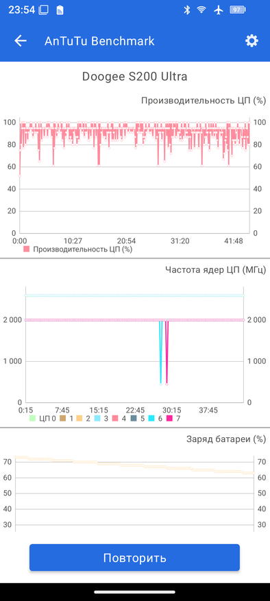 В CPU Throttling Test — троттлинга практически нет. Но здесь нам больше важно значение GIPS (1 GIPS — это 1 миллиард операций в секунду). Среднее значение получается 237 GIPS, что очень даже неплохо. И также прогнал стресс-тест в Antutu. И, как видите, производительность уверенно держиться на 80-90%. Процессор производительный и сопостовим со Snapdragon 7 Gen 4. При прогоне тестов корпус нагревается в верхней части примерно до 40 градусов.