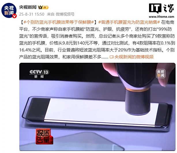31 августа 2025 года телеканал CCTV опубликовал результаты расследования эффективности защитных пленок для мобильных телефонов, рекламируемых как средство защиты от синего света. Согласно отчету, большинство протестированных образцов показали крайне низкую эффективность блокировки синего излучения.