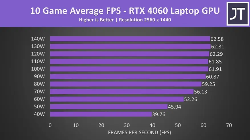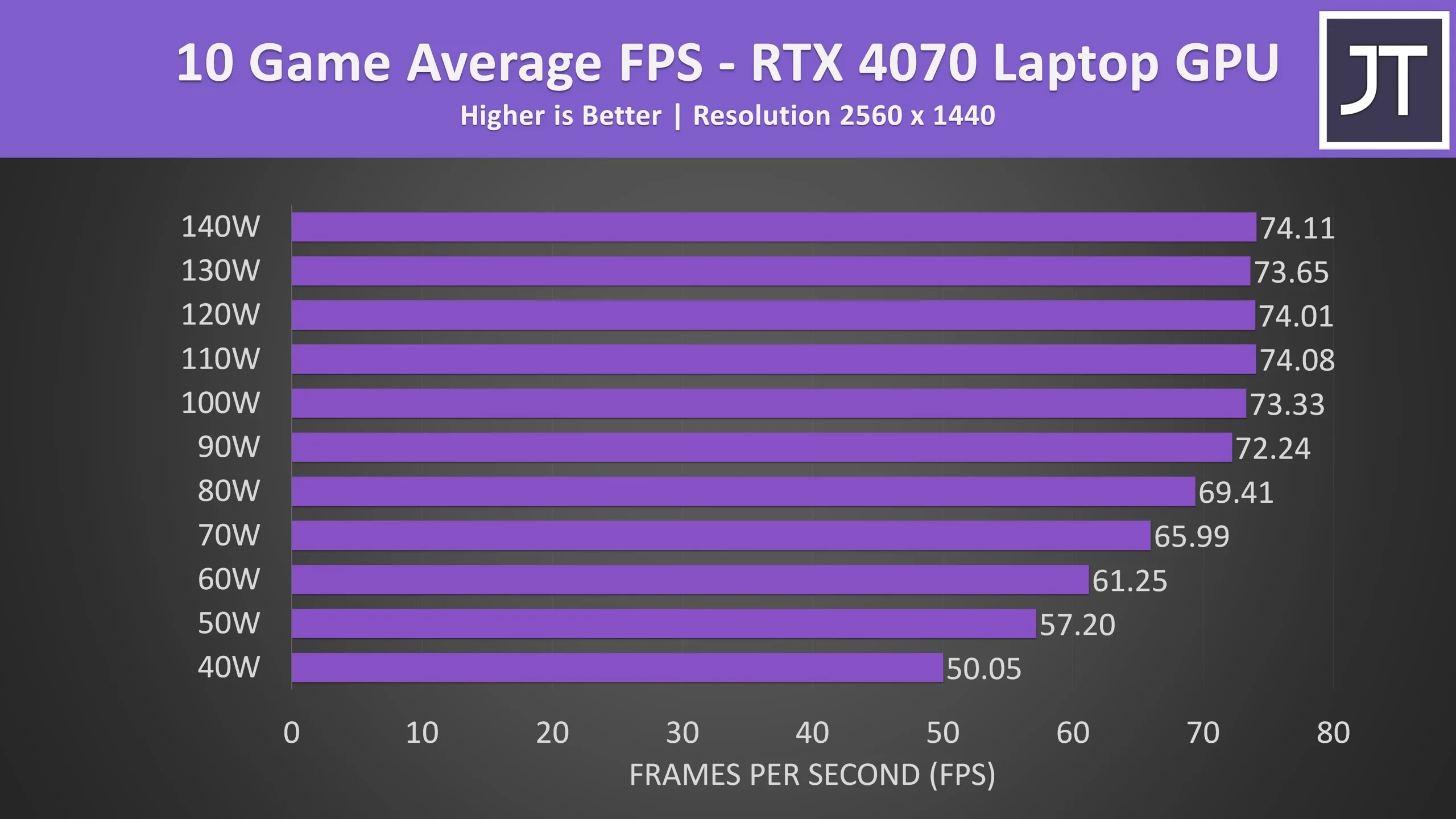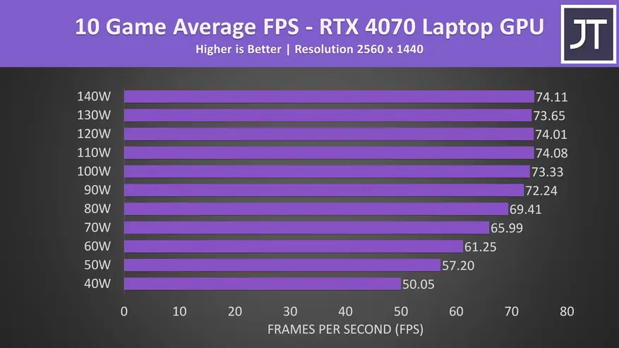 Да, если собираешься играть на этом, то безусловно лучше взять модель с максимально возможным потреблением, но тут мы встречаем такую чудеснейшую проблему, как непропорциональное соотношение роста температуры и производительности. Как правило, даже из приложенных графиков (кстати, вот спасибо, действительно полезная и удобная информация) видно, что у той же самой ноутбучной 4070 (приблизительно равна десктопной РТХ3070 без разгонов и прочего) после 100 ватт потребления роста производительности практически не наблюдается. Следовательно, куда уходит все потребление? Правильно, в нагрев.