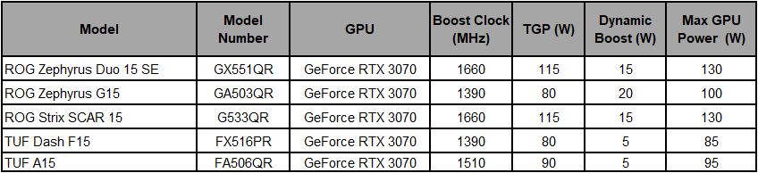 Согласно вышеприведенной таблице от Asus, стандартное энергопотребление ноутбучной Nvidia RTX 3070 может составлять как 80 Вт, так и 115 Вт, а с учетом технологии Dynamic Boost получаем 130 Вт и 85 Вт. Тактовая частота графического процессора из-за этого тоже значительно отличается: 1660 МГц и 1390 МГц соответственно.