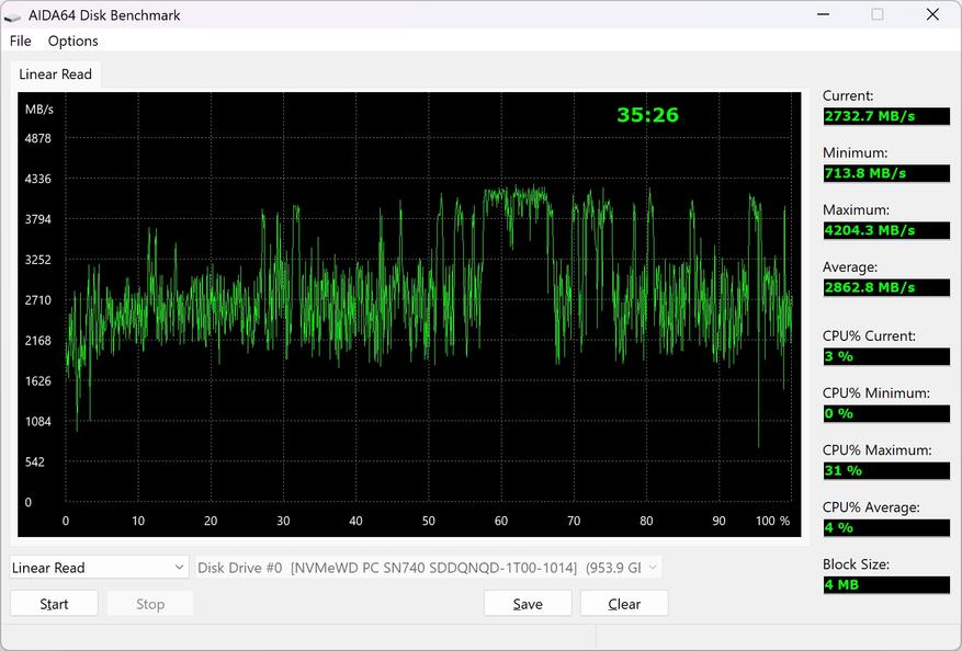 Скорость накопителя проверял разными способами. В линейном чтении получилась довольно высокая средняя — около 2800 МБ/с, с пиками до 4200 МБ/с. Результат нестабильный, но в пределах ожидаемого для NVMe-дисков без радиатора. В повседневной работе это не сказывается, но под нагрузкой возможны кратковременные провалы.