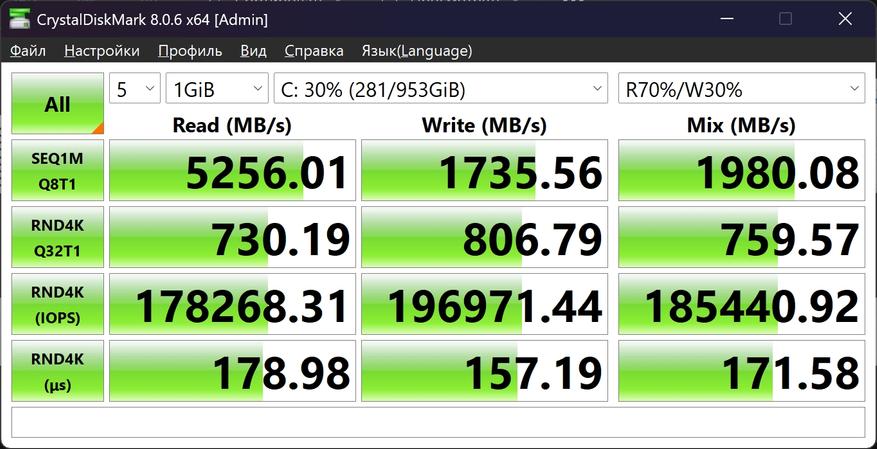 С произвольными 4K-операциями ситуация неоднозначная. При большой нагрузке IOPS высокий, задержки в пределах нормы, но в однопоточном сценарии скорость заметно проседает — особенно при чтении. Это чувствуется, например, при загрузке системы или запуске программ сразу после включения. Но в целом для офисных задач и браузинга диск работает быстро. Специального охлаждения не требует, хотя под длительной нагрузкой может прогреваться.