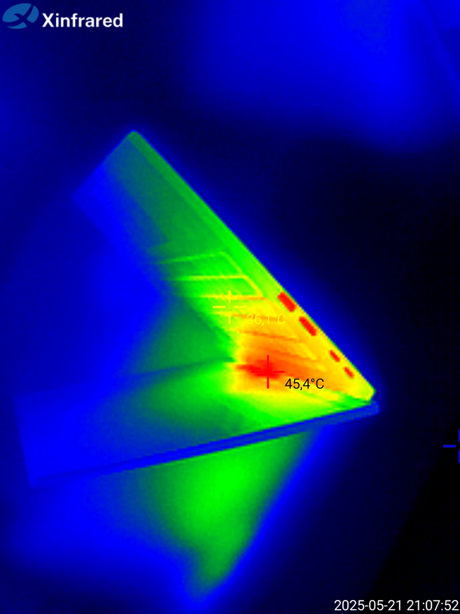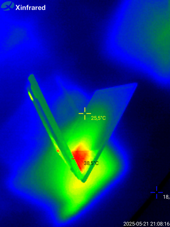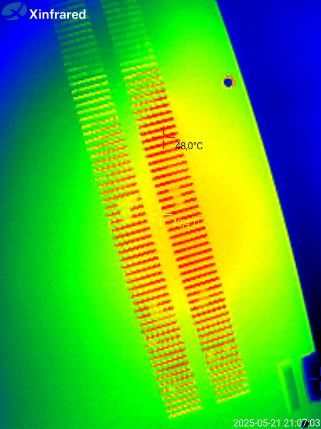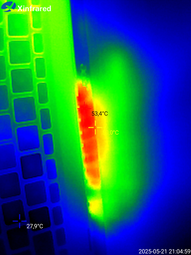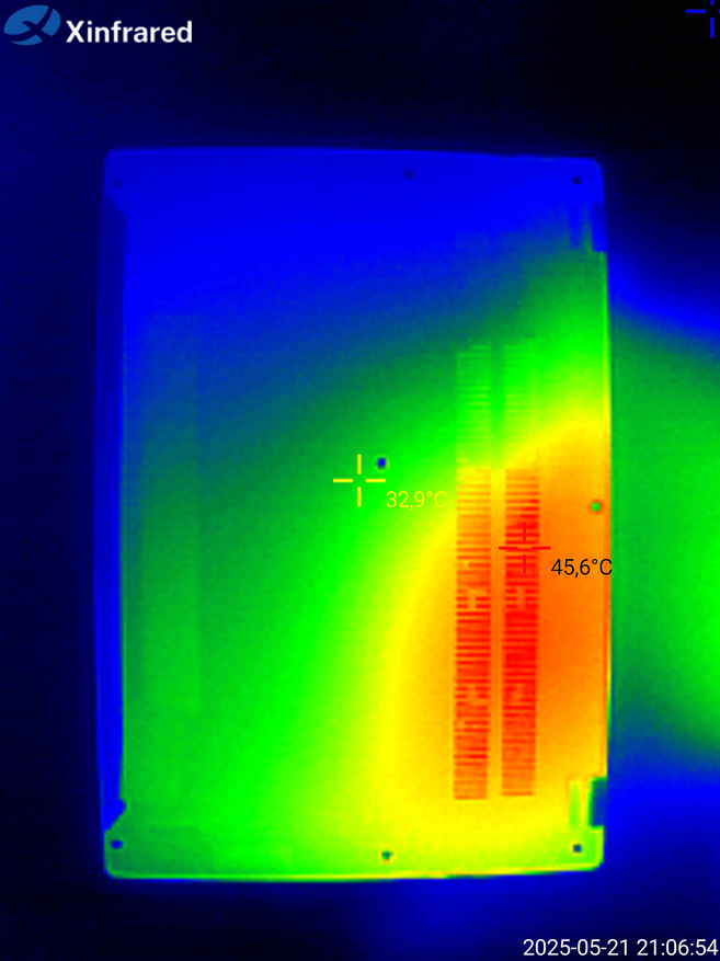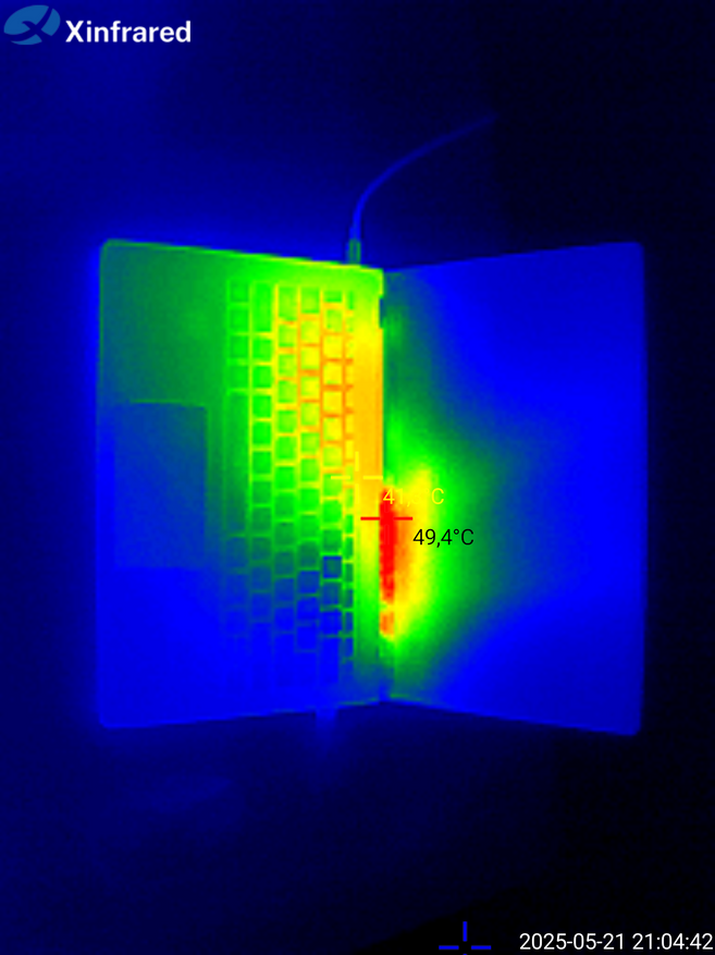 Тепловой замер проводился после двух часов непрерывной нагрузки, и зафиксированные значения позволяют оценить поведение системы охлаждения в условиях высокой утилизации. Наиболее теплая область корпуса находится между клавиатурой и дисплеем, где расположены вентиляционные отверстия. Именно туда отводится основная часть тепла, что подтверждается температурой до 53.4°C в этой зоне. При этом корпус в области клавиатуры остается ощутимо прохладнее, что положительно сказывается на комфорте при длительной работе. Снизу корпус также нагревается, но распределение температуры остается умеренно равномерным, без резких перегревов. Прибор зафиксировал пиковое значение нагрева в зоне выдува воздуха, и с точки зрения компоновки это ожидаемое поведение. Несмотря на достаточно компактный корпус, термокарта демонстрирует адекватный контроль температур: система отводит тепло наружу, не создавая критических точек перегрева в местах контакта с руками.
