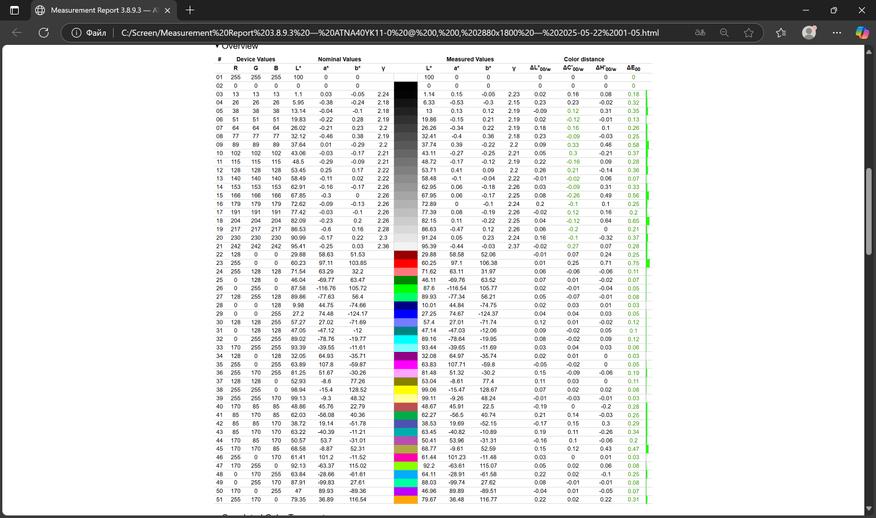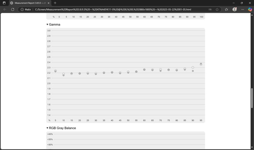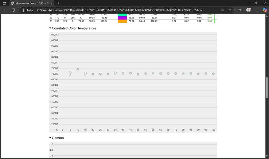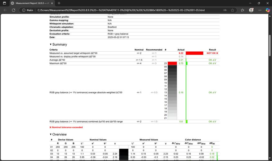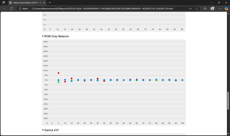Точка белого была близка к эталонной — измеренное значение xy 0.3027/0.3331 соответствует цветовой температуре около 7016К. При сравнении с целевыми координатами расхождение составило dE 9.22, что выходит за рекомендуемые пределы, но это отклонение связано исключительно с отклонением по цветовой температуре — на практике глаз не воспринимает его как критическое. При этом точность цветопередачи внутри профиля оказалась высокой: среднее значение dE00 составило 0.21, а максимум — 0.75. Это означает, что для большинства оттенков визуальных искажений не будет вообще, а профессиональная точность уже почти достигнута из коробки. RGB-баланс оказался стабильным — на шкале серого никаких провалов или перекосов не выявлено. Все три канала идут почти параллельно с минимальными колебаниями, и только на самом нижнем пороге заметна небольшая разбалансировка, не влияющая на общую картину.