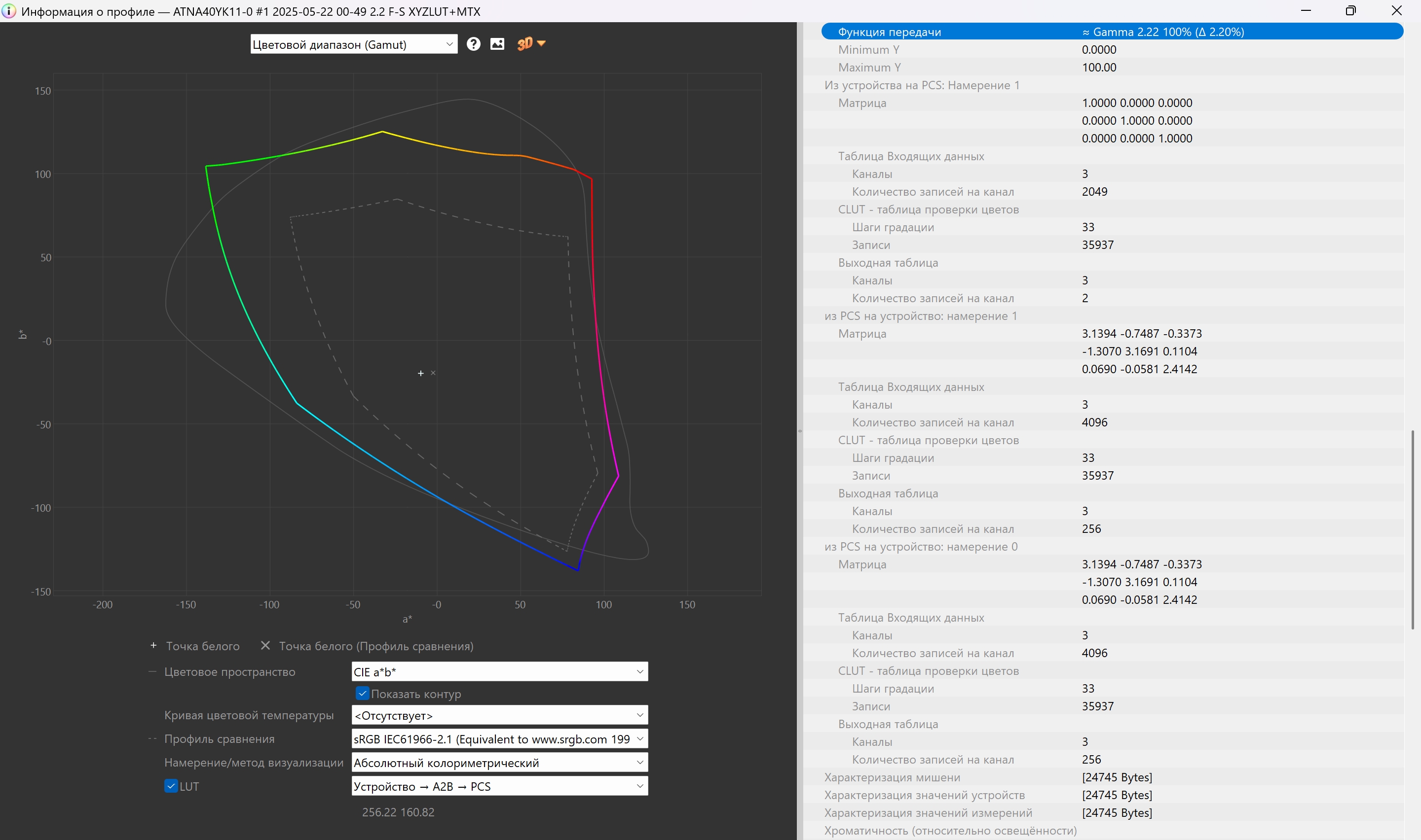Гамма-кривая практически совпадает с целевой 2.2, отклонение не превышает 2.2% и укладывается в допустимые пределы для визуально нейтрального восприятия. Линейность каналов также подтверждена — каждый цвет передается равномерно по яркостной шкале, без провалов в тенях или пересвета в светах. Субъективно изображение выглядит насыщенным, но не пересвеченным, тональный переход — мягкий, без резких границ. Это особенно заметно на градиентах и серых заливках, где нет характерной полосатости или изменения цветового тона при малейшем изменении яркости.