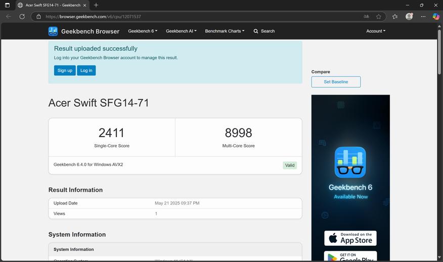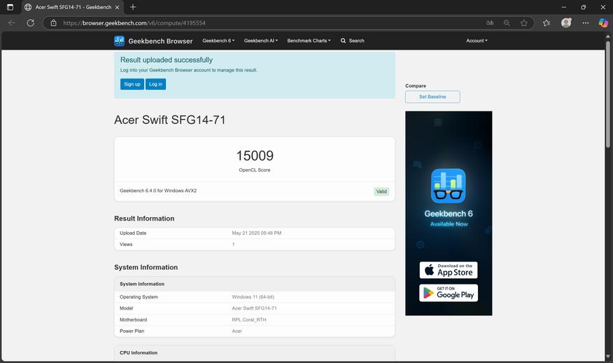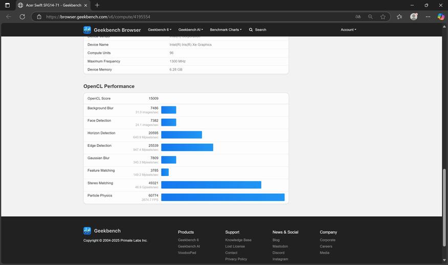 В тесте Geekbench 6 процессор продемонстрировал одноядерный результат 2411 баллов и совокупный показатель 8998 баллов. Эти значения подтверждают, что производительные ядра i7-1355U справляются с нагрузками, требующими высокой реакции в одном потоке, а гибридная конфигурация из двух P- и восьми E-ядер обеспечивает заметный прирост в параллельных задачах по сравнению с мобильными чипами предыдущего поколения серии U. Итоговый балл OpenCL, равный 15 009, показывает возможности встроенной графики Intel Iris Xe при вычислительных сценариях, опирающихся на GPGPU-ускорение: ускорение операций распознавания, рендер на базе движков, использующих OpenCL, и работу редакторов, задействующих GPU для фильтров и эффектов. В сумме цифры отражают сбалансированный уровень производительности для офисных, браузерных и мультимедийных рабочих процессов, а указывают на допустимый запас для несложного контент-креатива, если он не упирается в тяжелую 3D-графику.