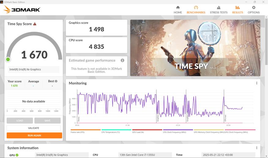Для дополнительной оценки использовались синтетические бенчмарки. В тесте 3DMark Time Spy конфигурация с встроенной графикой Intel Iris Xe набрала 1670 баллов, из которых 1498 пришлось на графику и 4835 на центральный процессор. Такой результат подтверждает базовую совместимость с современными DirectX 12 приложениями, но указывает на ограничения встроенного графического ядра в ресурсоемких задачах.
