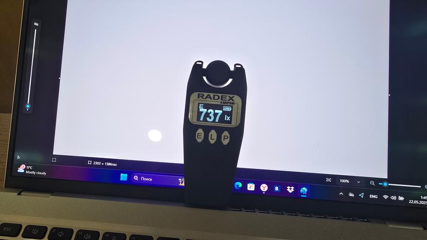 Для оценки равномерности подсветки я провел замеры освещенности в девяти точках экрана, используя люксметр. Измерения проводились на максимальной яркости, значения находились в пределах от 736 до 743 люкс. Разброс получился минимальным — всего около 1%, что говорит о высокой однородности светового потока по всей площади дисплея. Визуально яркость воспринимается одинаковой как в центре, так и по краям, без затемнений или выбросов.