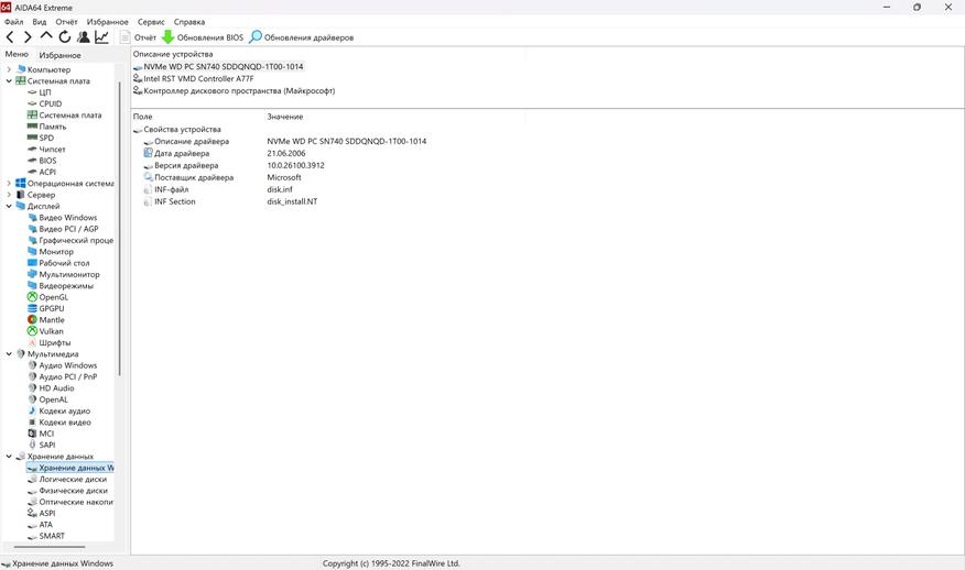 В качестве накопителя используется NVMe SSD Western Digital PC SN740 объемом 1 ТБ, подключенный по интерфейсу PCIe 4.0. Данный контроллер не предполагает наличие радиатора, так что при продолжительных нагрузках возможен нагрев, что в определенных условиях может сказываться на скорости работы. Объема и интерфейсной скорости вполне достаточно для задач, связанных с быстрой загрузкой системы, запуском приложений, обработкой файлов и мультимедиа.