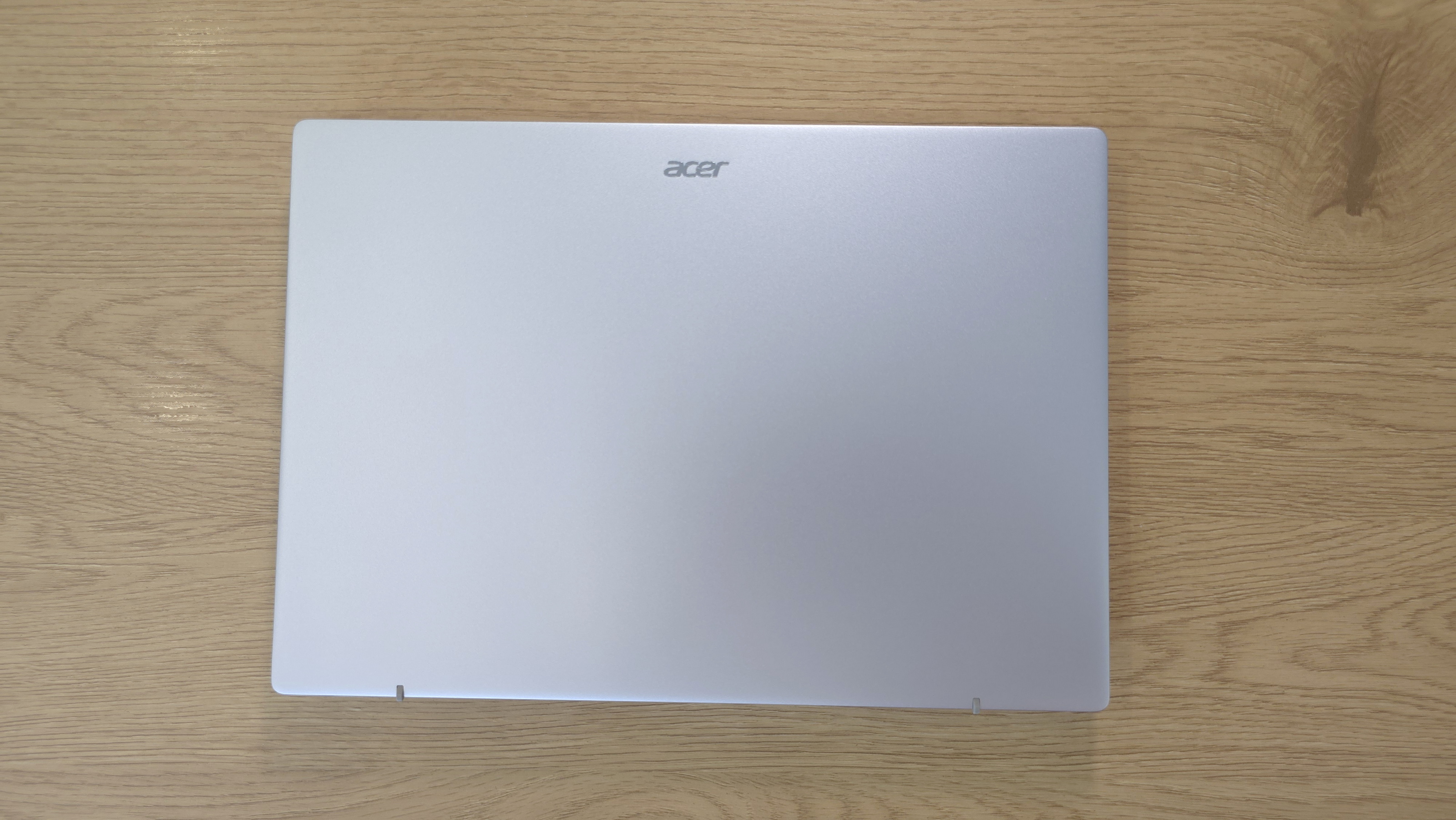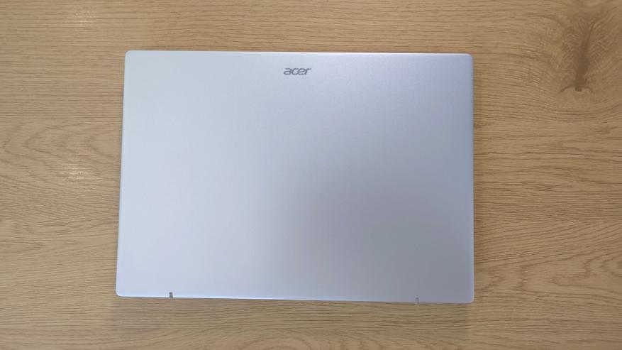 Верхняя часть корпуса — это гладкая серебристая крышка без выступающих элементов. В центре, в верхней части — фирменный логотип Acer, выдавленный в металле. В закрытом положении корпус смотрится цельным, шарниры визуально почти не выделяются.
