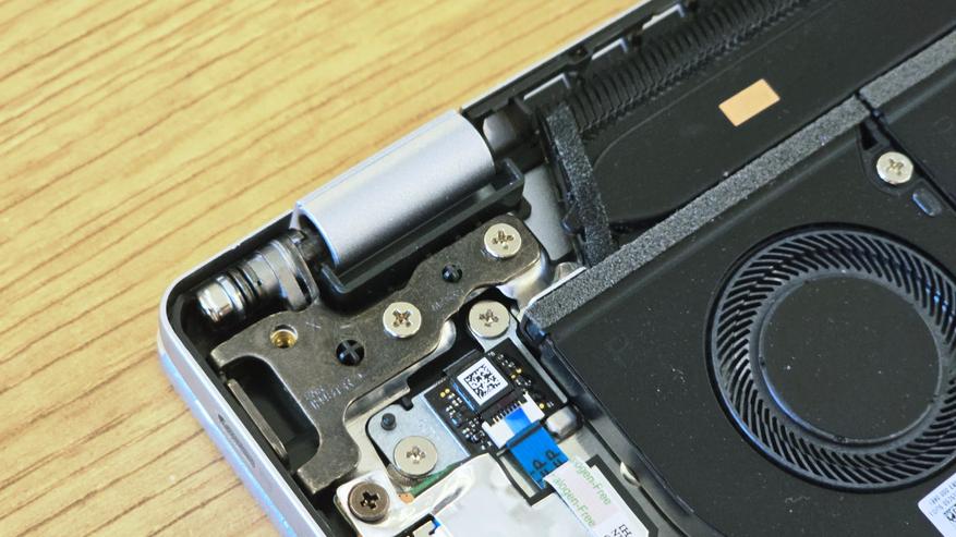 Петли крепления дисплея выглядят основательно — здесь применен металлический каркас, зафиксированный несколькими винтами, с ограничителем хода. Петли обладают заметной толщиной и работают через раздельную конструкцию, в которой шасси дисплея соединено с корпусом через шарнирный механизм. Жесткость фиксации достаточная — при открывании нет люфта, равномерное усилие чувствуется на всем протяжении движения. Учитывая наличие OLED-экрана, важно, что шлейфы проложены без перегибов и изолированы.