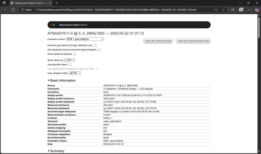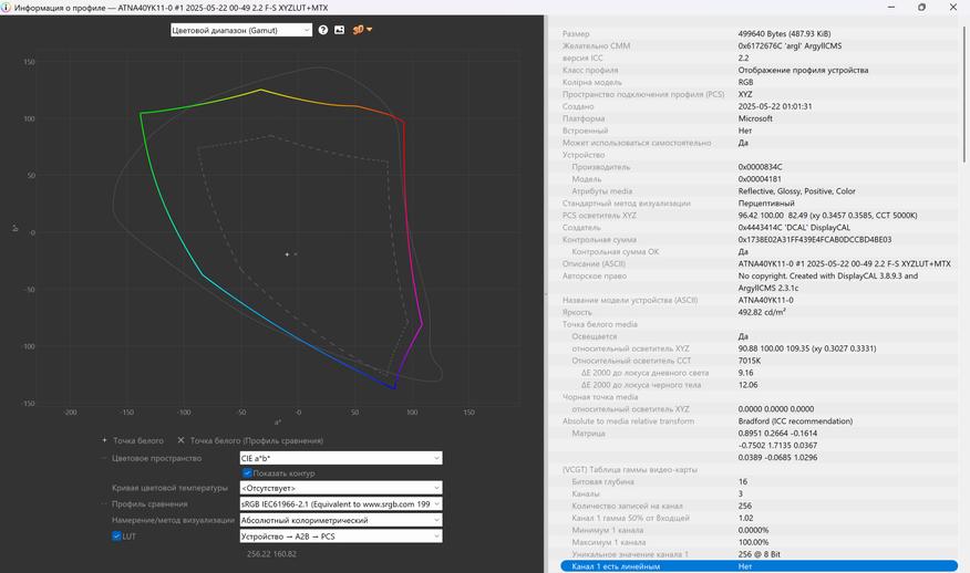 Дисплей тестировался без калибровки — задача заключалась в том, чтобы оценить реальные параметры, с которыми устройство поставляется с завода. В основе — OLED-панель, и это заметно с первых минут: черный цвет абсолютно глубокий, уровень яркости высокий, а контрастность не просто выше среднего — она формально бесконечна. Физически измеренный уровень черного составил ровно 0 кд/м², что подтверждает отсутствие подсветки, как и положено OLED. Пиковая яркость, достигнутая при ручной установке максимального значения, зафиксирована на уровне 492 кд/м², что подтверждается как замерами, так и паспортными данными. Этого достаточно для комфортной работы даже при дневном освещении, без необходимости использовать автоподстройку.