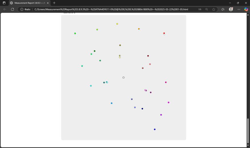 Acer Swift Go 14 SFG14-71-72QX (NX.KMZCD.001) оставил двоякое впечатление, в котором сильные стороны контрастируют с нюансами, требующими уточнения перед покупкой. С одной стороны, здесь установлен качественный OLED-экран с практически полной цветопередачей пространства sRGB, высокой равномерностью яркости и приемлемым уровнем ШИМ — на максимальной подсветке мерцание фиксируется в пределах 11.6%, что допустимо для длительной работы без ощутимого дискомфорта. Яркость в центральной зоне достигает почти 740 lx, а отклонения по краям минимальны. Цветовой профиль после измерений показал отличную точность — среднее отклонение DE не превышает 0.2, хотя из коробки цветовая температура может немного уходить в сторону, если ориентироваться на точку белого по стандарту D65. Это характерно для OLED-панелей с индивидуальными характеристиками.