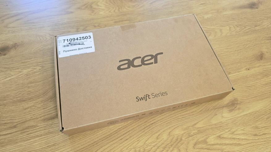 Acer Swift Go 14 SFG14-71-72QX поставляется в коробке из переработанного картона без цветной полиграфии. Единственный визуальный элемент — небольшая наклейка с техническими характеристиками и обозначением модели. Упаковка выполнена в минималистичном стиле.
