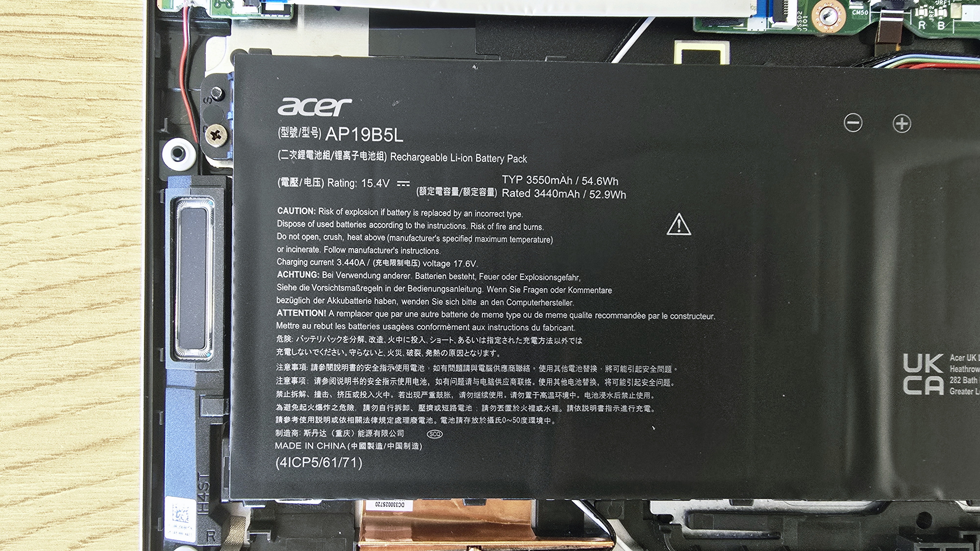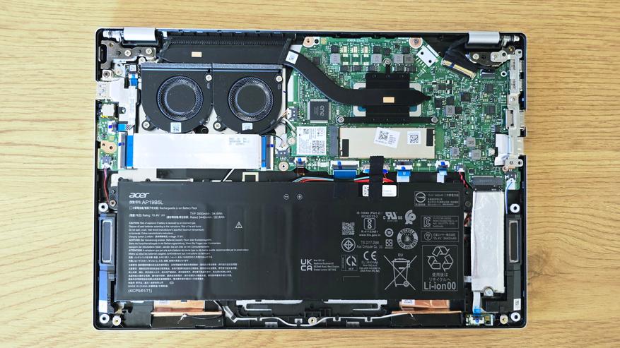 Разборка устройства позволила оценить, насколько грамотно реализована внутренняя архитектура. Внутреннее пространство организовано плотно, но без ощущения хаоса. Батарея на 54.6 Вт·ч занимает всю нижнюю часть корпуса, фиксируется винтами, подключена через обычный четырехпиновый разъем. Выше размещается пара вентиляторов, направленных на обдув радиатора, соединенного с процессором при помощи единственной тепловой трубки. Такая система охлаждения выглядит вполне типичной для ультрабуков. В районе процессора установлена память, а также Wi-Fi модуль с антеннами, разведенными по углам корпуса. Использованы радиэкраны и уплотнительные прокладки, что указывает на продуманную теплоизоляцию и защиту от помех. Аккуратная укладка кабелей, четкие метки на шлейфах и использование стандартных разъемов облегчают потенциальное обслуживание.