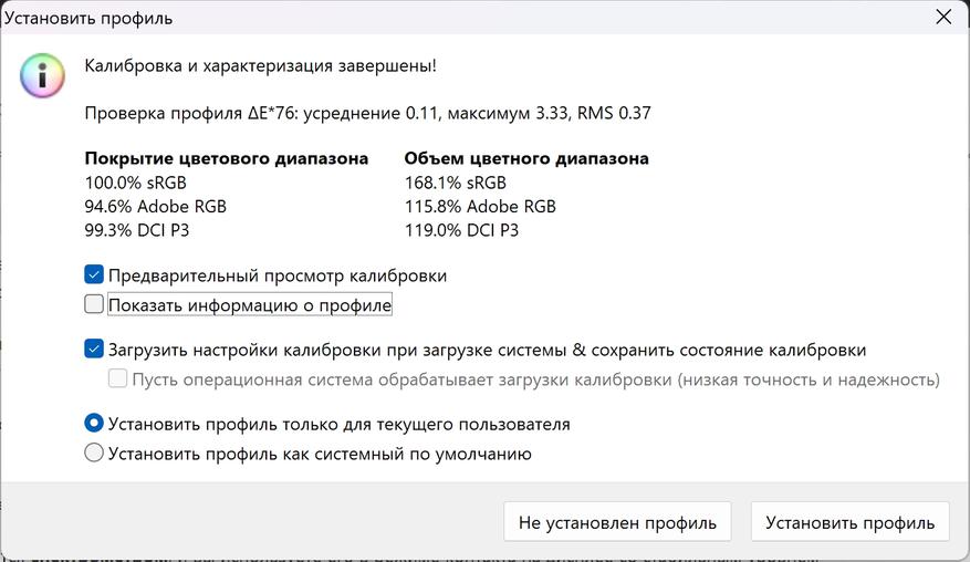 Экран полностью покрывает sRGB (100%), охватывает 94.6% AdobeRGB и 99.3% DCI-P3. Что важнее, объем цветового охвата превышает эти пространства — соответственно, при необходимости можно настроить отображение более насыщенной палитры. Панель отображает до 168% sRGB, что характерно для OLED-дисплеев, и требует принудительного сужения охвата, если нужен строгий стандартный режим, например, для работы с Web-контентом.