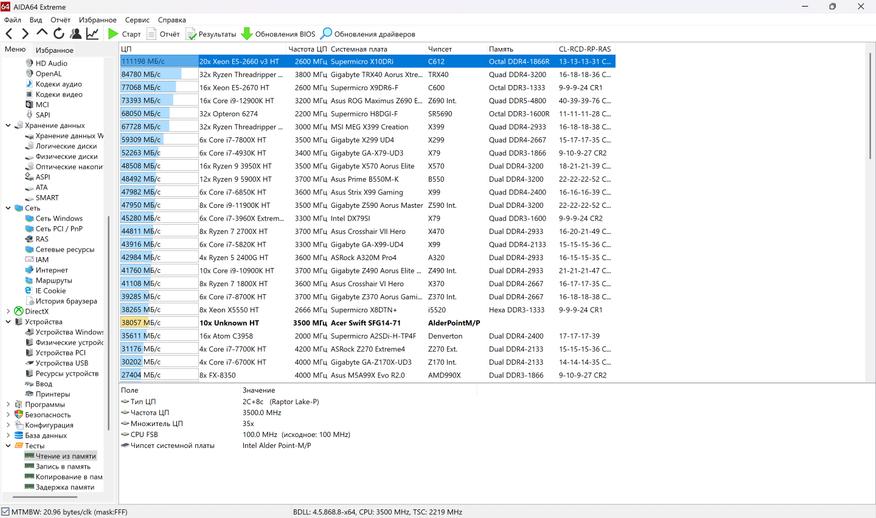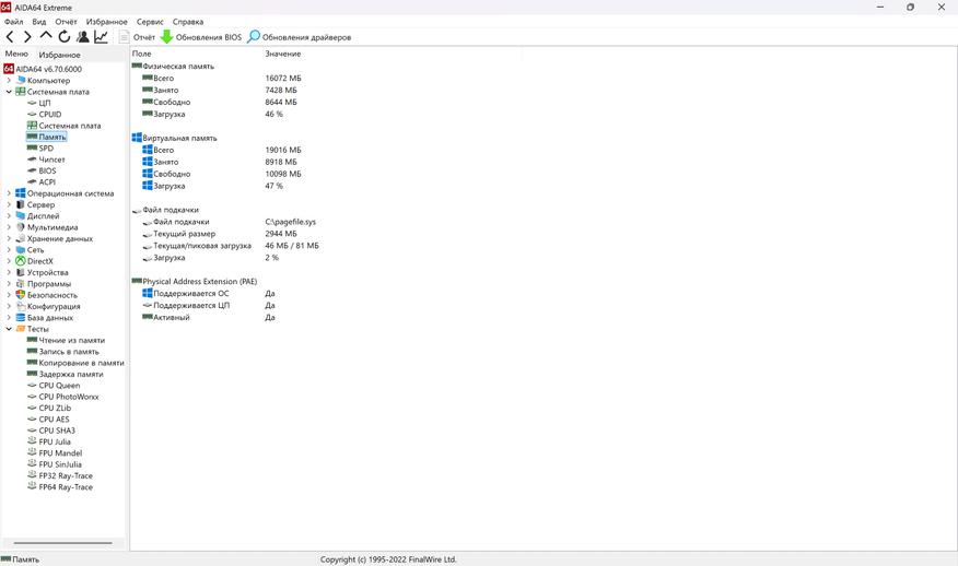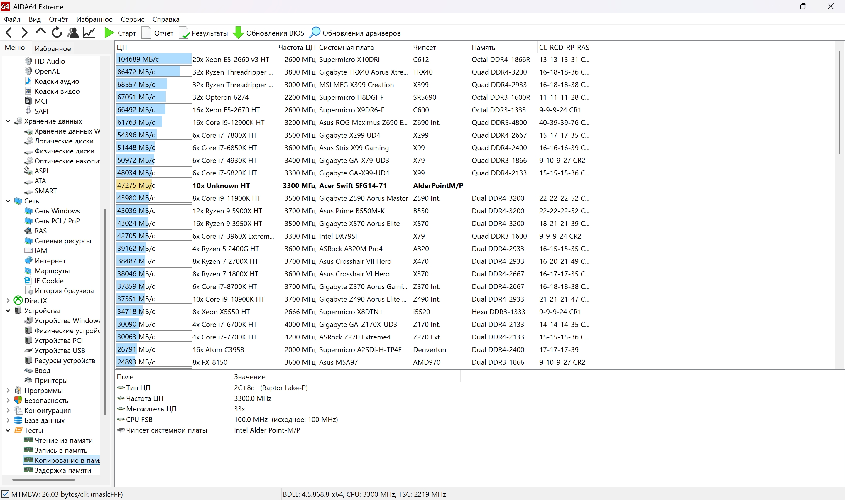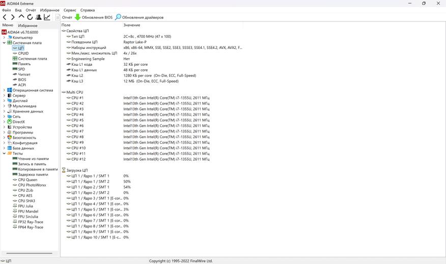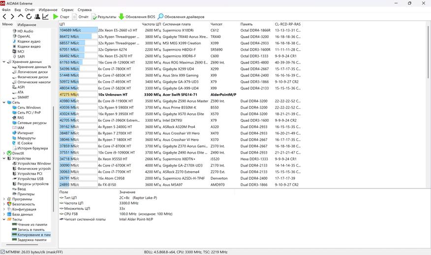 В тестах AIDA64 система показала ожидаемый для своего класса результат. Скорость чтения оперативной памяти составила чуть меньше 40 ГБ/с, копирование проходило на уровне порядка 48 ГБ/с, а запись достигала почти 58 ГБ/с. Это средние значения для четырехканальной LPDDR5, встроенной в ноутбуки на платформе AlderPoint с процессорами семейства Raptor Lake-P. При этом задержка доступа оказалась немного выше, чем хотелось бы — около 117 нс, хотя такие показатели типичны для систем с распаянной энергоэффективной памятью.