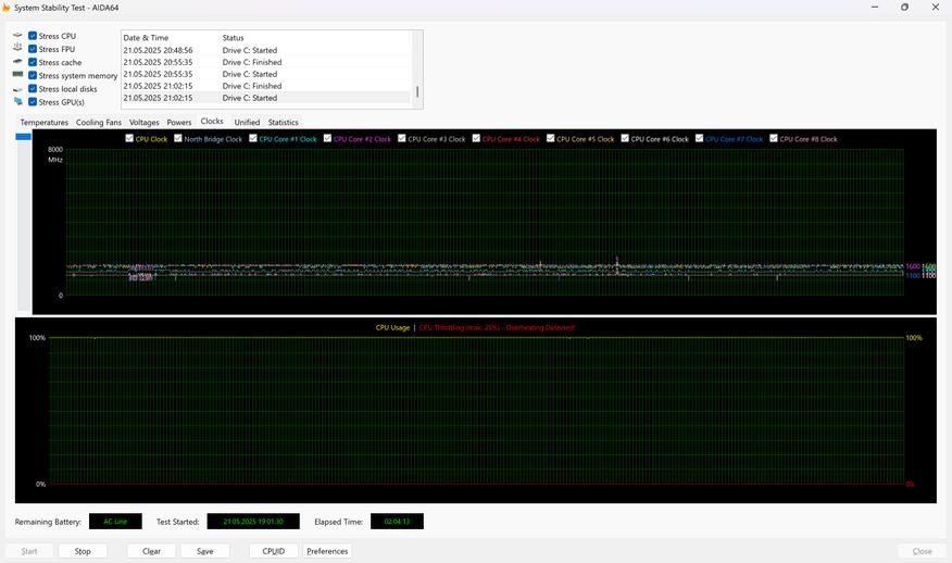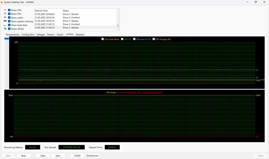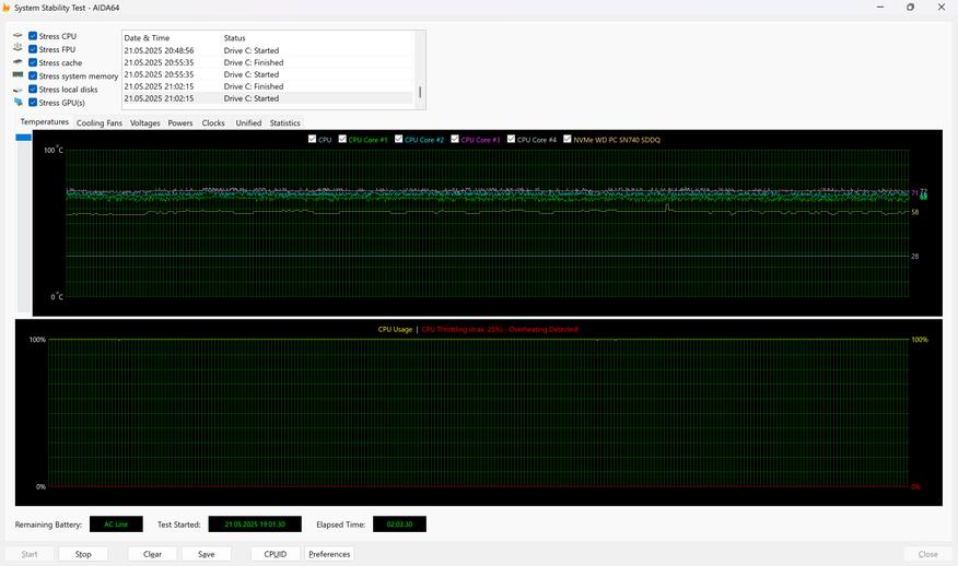 При проведении стресс-теста в AIDA64 были задействованы все основные подсистемы: процессор, встроенное графическое ядро, кэш, оперативная память и локальные накопители. Продолжительность тестирования составила чуть более двух часов. В течение всего времени нагрузка сохранялась на уровне 100%, что позволило проверить устойчивость платформы в затяжных пиковых условиях. В процессе наблюдалось срабатывание теплового троттлинга с пиковым снижением до 25%, что сопровождалось системным предупреждением о перегреве. Пиковое энергопотребление процессорного пакета составило почти 29 Вт, при этом работа всех ядер сохранялась в пределах стабильного диапазона — частоты не опускались ниже установленного минимума, колебания укладывались в рамки допустимого.