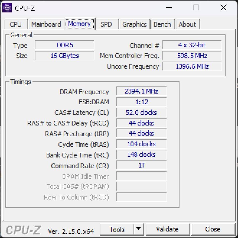 Объем оперативной памяти составляет 16 ГБ стандарта LPDDR5. Используется четырехканальная организация (4x32-бит), при этом память распаяна на материнской плате, слоты расширения отсутствуют. Частота работы модулей — около 4800 МГц (эффективная — 2394 МГц при передаче данных на канал), а задержки находятся на уровне типичных значений для LPDDR5 — CAS latency 52, tRCD/tRP — по 44. Производитель модулей — Micron Technology.