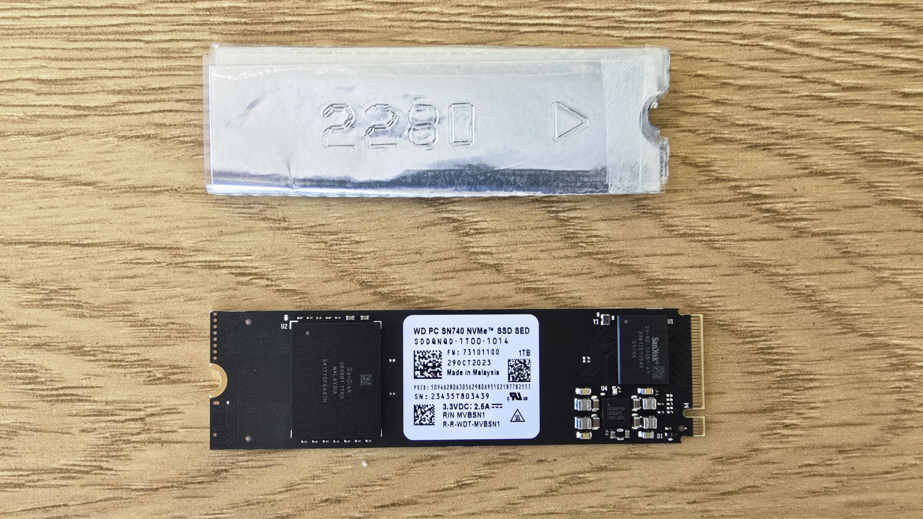 Снятый накопитель — WD PC SN740 на 1 ТБ — выполнен в одностороннем форм-факторе M.2 2280 и подключается по интерфейсу PCIe 4.0. Он оснащен отдельным теплоотводом из тонкого алюминия. Никаких проблем с доступом к слоту не возникает: добраться до накопителя можно без демонтажа других компонентов. Сам слот расположен в нижней правой части платы, рядом с одним из динамиков. Устройство использует одностороннюю компоновку — с размещением всех чипов с одной стороны — что важно при эксплуатации в корпусах с ограниченной толщиной. Сами элементы памяти производства SanDisk, контроллер также фирменный. Это типичное OEM-решение, но по тестам производительности его возможности ощутимо выше базовых моделей начального уровня.