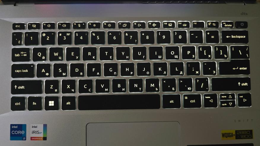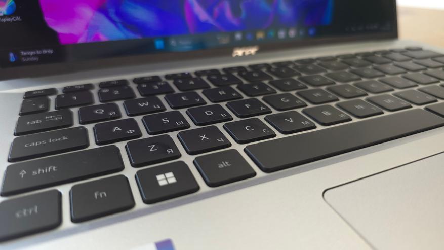 Клавиатура полноразмерная, без цифрового блока, с классическим островным расположением клавиш. На блоке клавиш F1-F12 размещены дополнительные управляющие команды, включая яркость, громкость и отключение микрофона. Кнопки слегка выступают из корпуса, имеется контурная подсветка. Раскладка двухязычная, русские символы нанесены тонко и аккуратно, цвет шрифта — светлый, читается хорошо. Под клавиатурой расположен крупный тачпад с матовой поверхностью, без физической разделенной кнопки. По размеру он занимает заметную часть подладонной зоны, что характерно для таких диагоналей. Предусмотрен сканер отпечатка пальца, который интегрирован в кнопку включения/выключения.