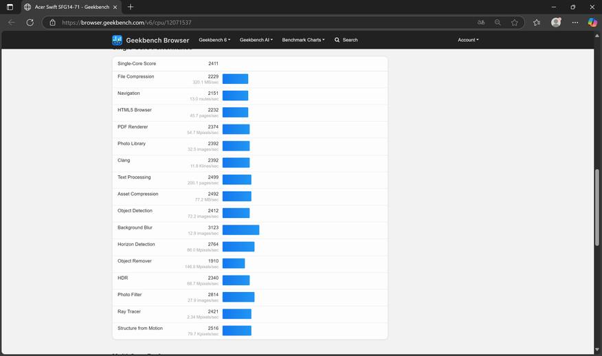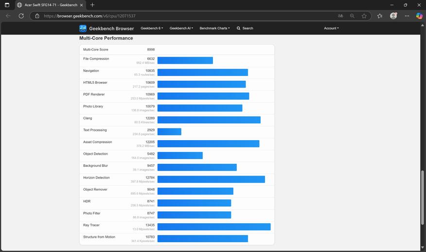 Кэш-подсистема также работала в пределах нормы: скорость обмена с L1 и L2 оставалась высокой, и никаких критичных узких мест в архитектуре не наблюдается. В списках рейтингов пропускной способности память ноутбука уверенно держалась ближе к нижней границе современных решений с DDR5, что объясняется спецификой LPDDR5 и компактной компоновкой устройства. Тем не менее, по общим характеристикам производительность памяти позволяет не только комфортно работать с офисными задачами, но и без проблем запускать ресурсоемкие приложения вроде графических редакторов или браузеров с десятками вкладок.