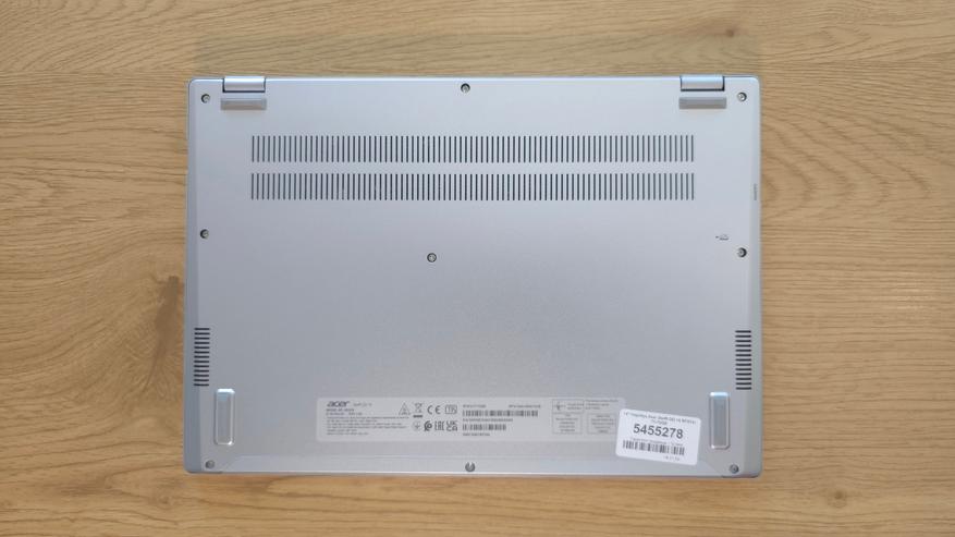 Что касается конструкции, то внутри все собрано аккуратно: используется компоновка с двумя вентиляторами, радиатором с одной тепловой трубкой и полноценной разборной механикой. Петли дисплея выглядят надежно, ход крышки равномерный, без люфтов. Есть доступ к накопителю, батарее и беспроводному модулю, что пригодится в долгосрочной перспективе. При этом корпус не перегревается — охлаждение справляется со своей задачей даже в момент запуска ресурсоемких задач.