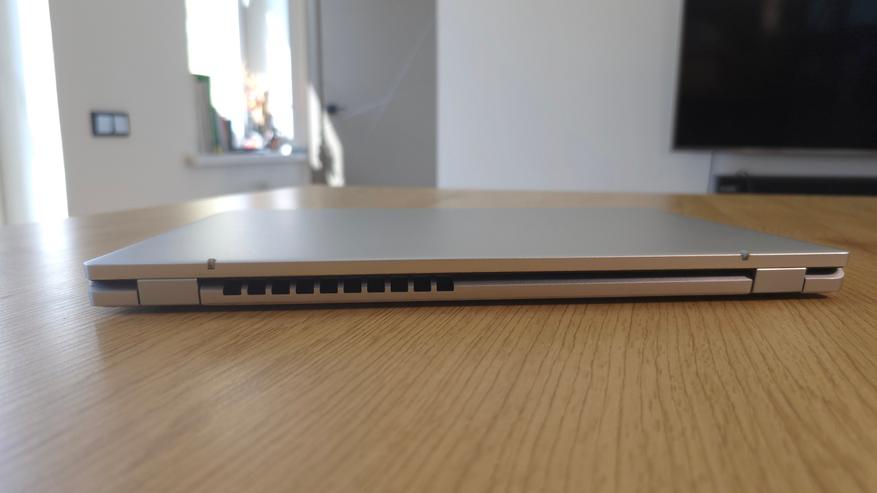 Сзади и спереди устройство не имеет никаких портов или элементов управления — крышка раскрывается стандартным способом, одной рукой открыть ноутбук не получится из-за жесткости шарниров.
