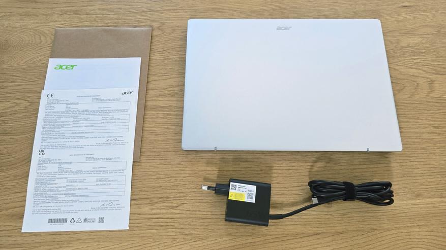 Внутри — сам ноутбук, зарядное устройство мощностью 65 Вт с разъемом USB-C и стандартная документация. Комплект поставки базовый, без дополнительных аксессуаров. Все размещено аккуратно и надежно зафиксировано в формованных вставках.
