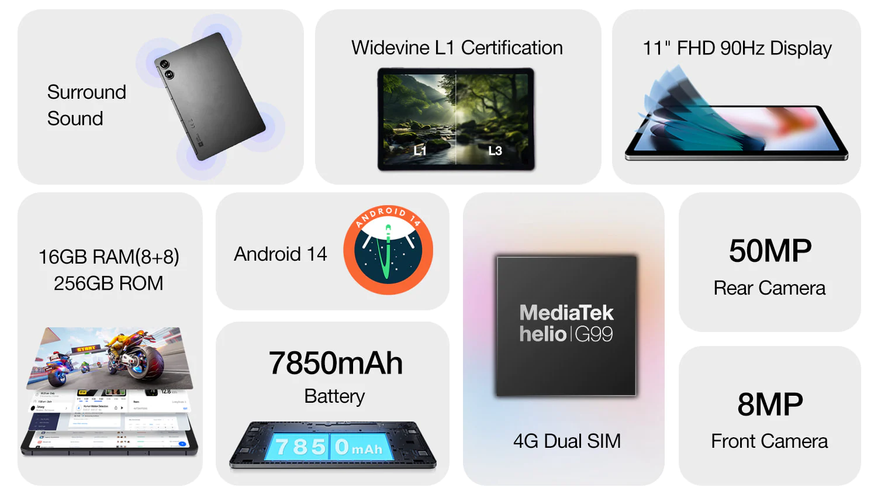 Pad P2 работает на мощном чипе MediaTek Helio G99, с 8 ГБ оперативной памяти и 256 ГБ встроенной памяти. Операционная система Android 14 обеспечивает быструю и плавную работу устройства, а возможность использовать две SIM-карты и поддержка 4G расширяют его функциональность.
