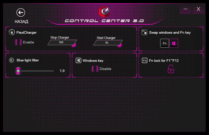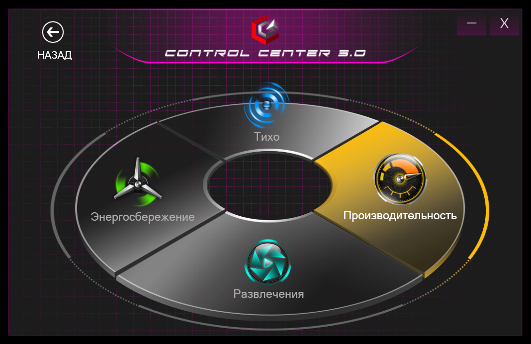 Сразу стоит сказать, что есть фирменная программа для настройки режимов работы, подсветки и других параметров, которая встречается на ноутбуках с платформой Clevo. В ней есть выбор режима работы: Энергосбережение, Тихий, Развлечение, Производительность. Это напрямую влияет на TDP выделяемый для работы процессора.
