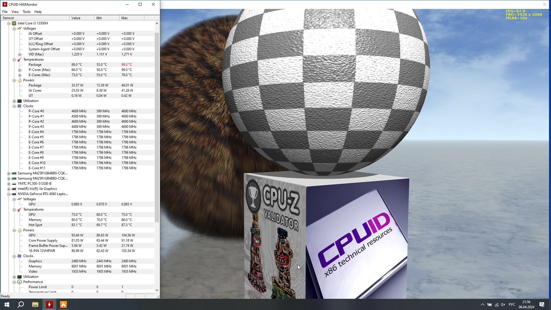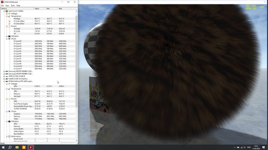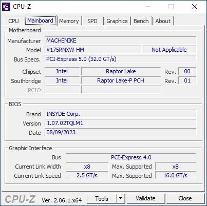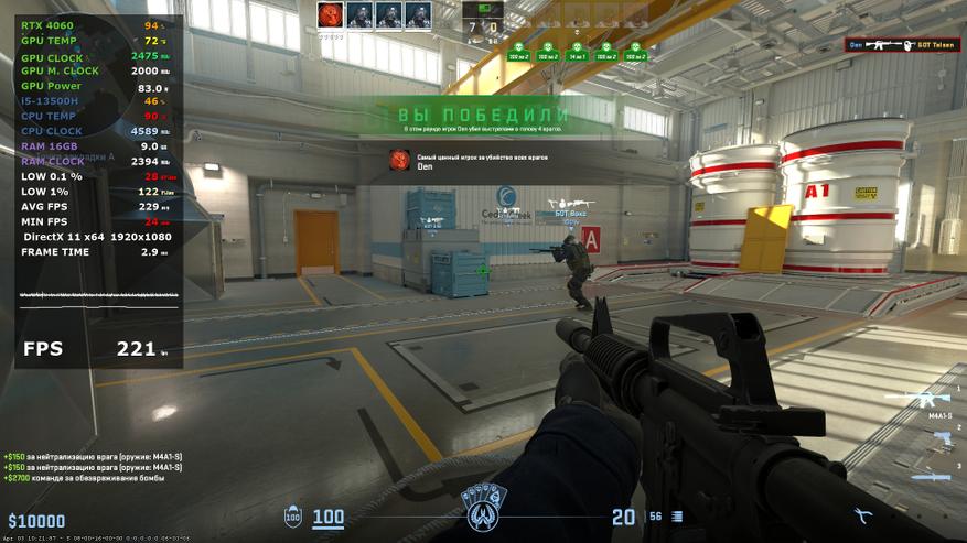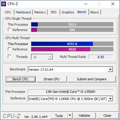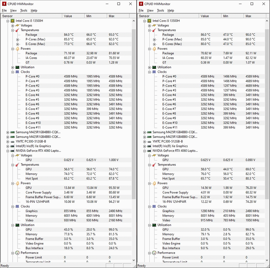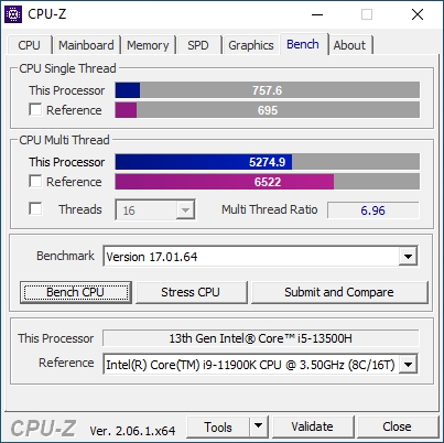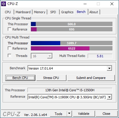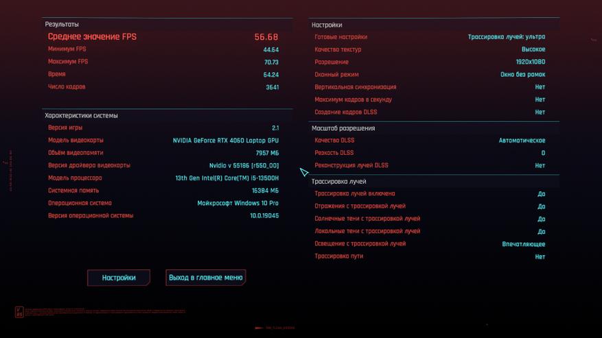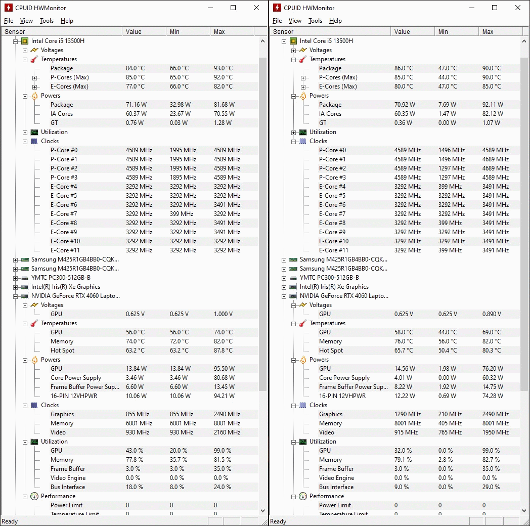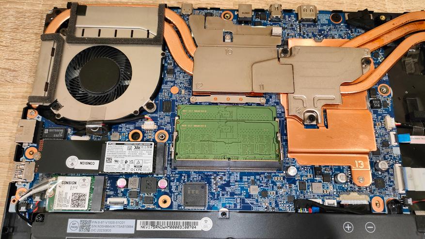 В основе ноутбука лежит процессор Intel 13-го поколения — Core i5-13500H в котором 4 P-ядра с HT и частотной формулой 2.6-4,7 ГГц, в то время, как E-ядер 8 штук, а частоты 1.9-3.5 ГГц. Стандартное значение TDP 45 Вт, с возможностью конфигурирования вендором, потолок равен 115 Вт. В пару к нему установлено 2*8 ГБ оперативной памяти DDR5 с частотой 4800 МГц. Пока этого хватает для игрового устройства с FHD экраном.