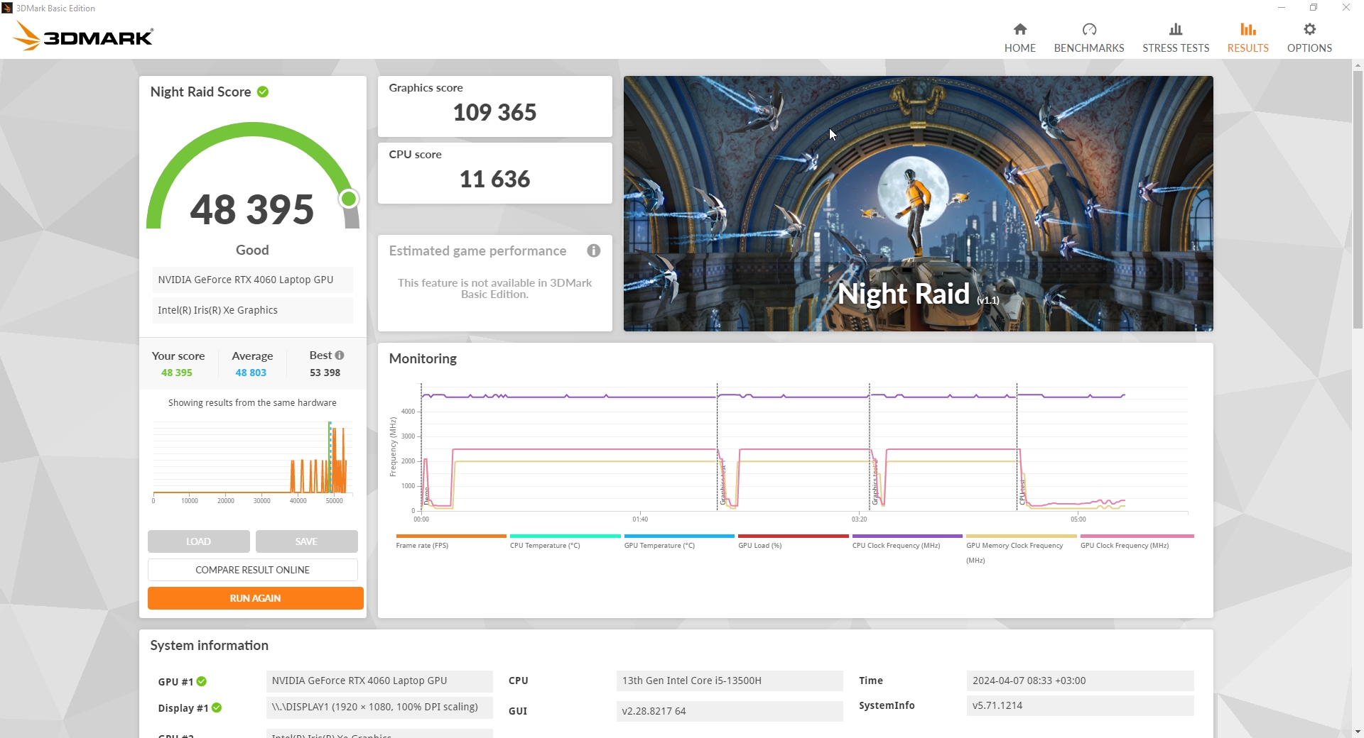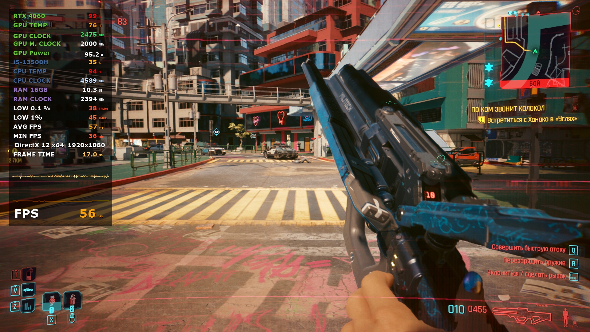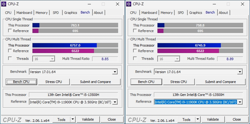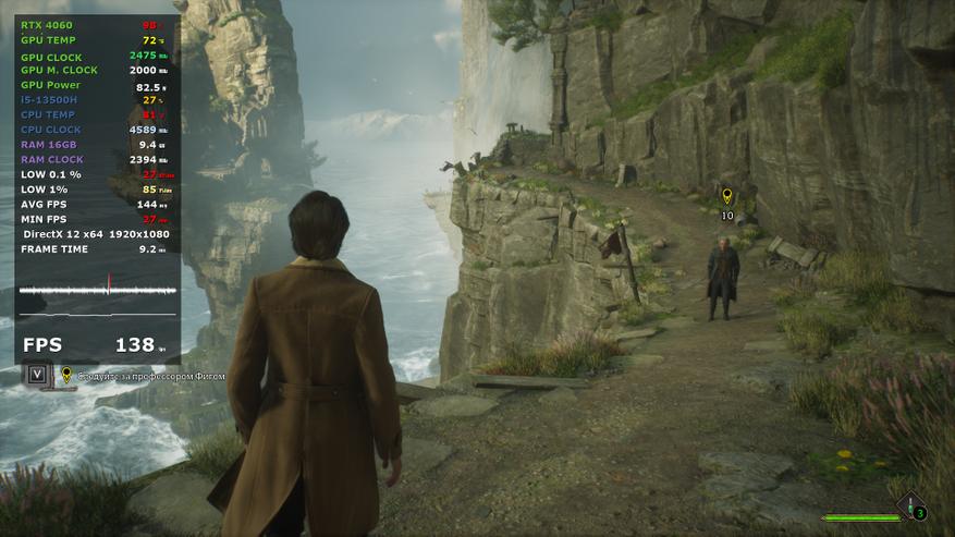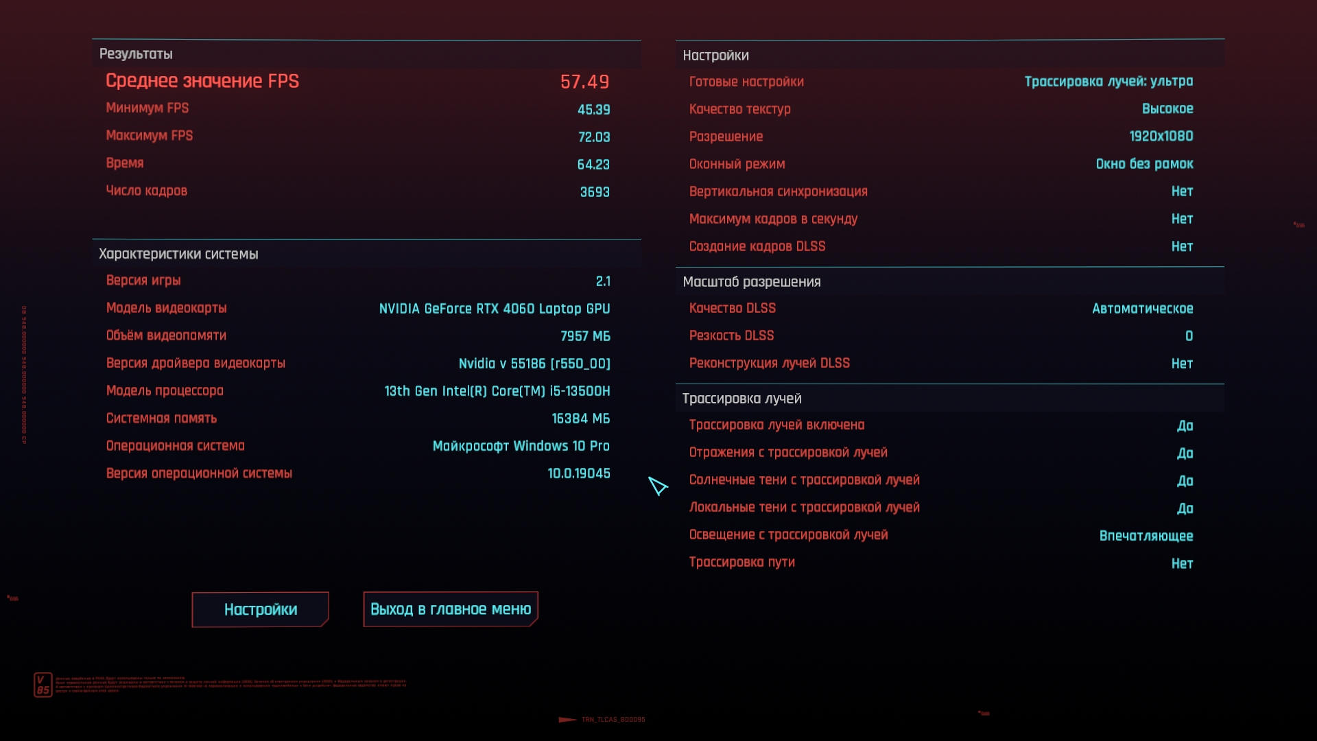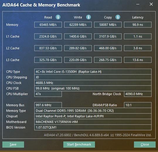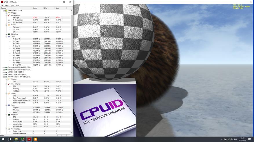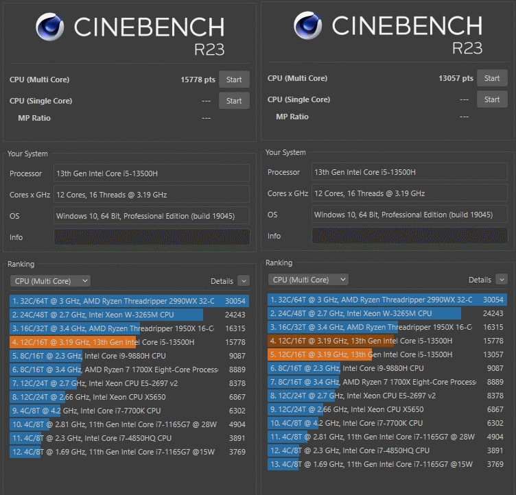 В основе ноутбука лежит процессор Intel 13-го поколения — Core i5-13500H в котором 4 P-ядра с HT и частотной формулой 2.6-4,7 ГГц, в то время, как E-ядер 8 штук, а частоты 1.9-3.5 ГГц. Стандартное значение TDP 45 Вт, с возможностью конфигурирования вендором, потолок равен 115 Вт. В пару к нему установлено 2*8 ГБ оперативной памяти DDR5 с частотой 4800 МГц. Пока этого хватает для игрового устройства с FHD экраном.