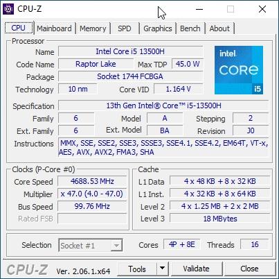 | Процессор | i5-13500H: 4 P-ядер с поддержкой HT на частоте от 2,26 ГГц до 4,7 ГГц, 8 E-ядер на частоте от 1,9 ГГц до 3,5 ГГц; TDP 35 Вт (до 115 Вт) |