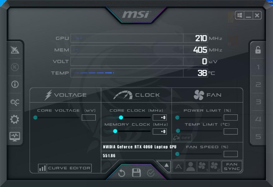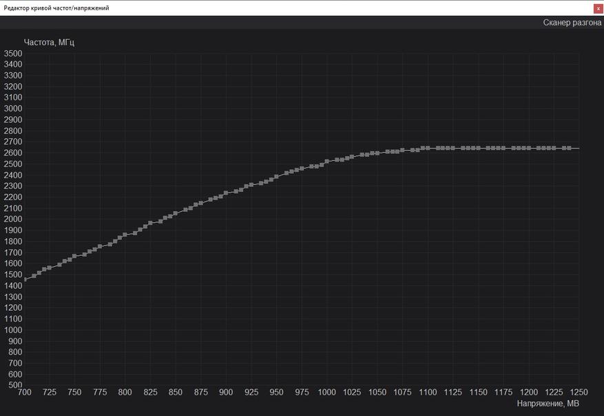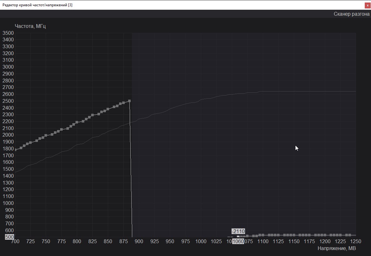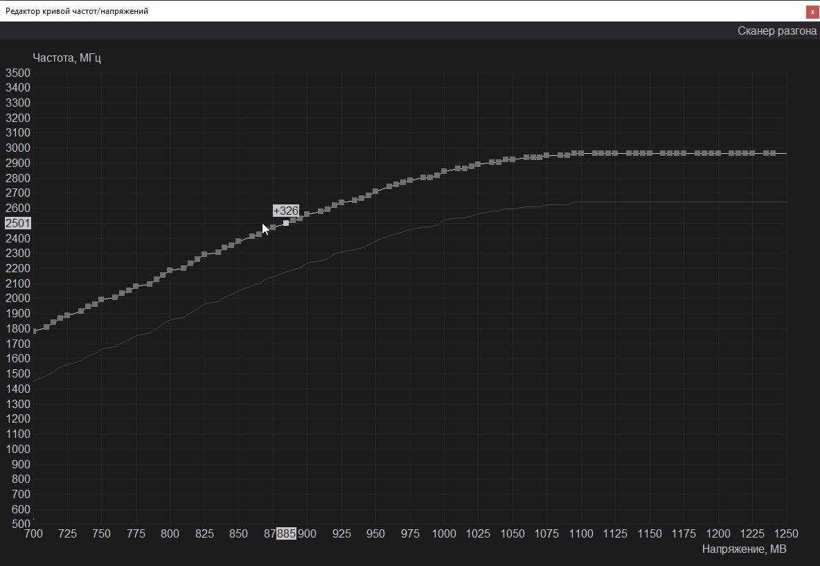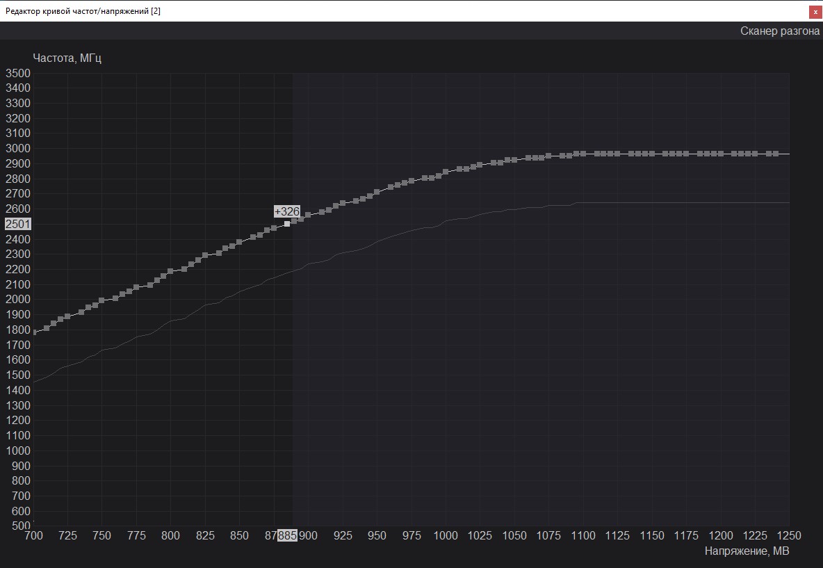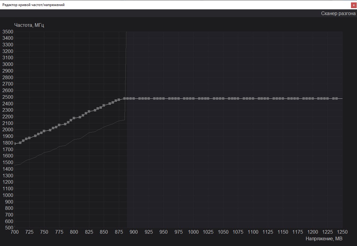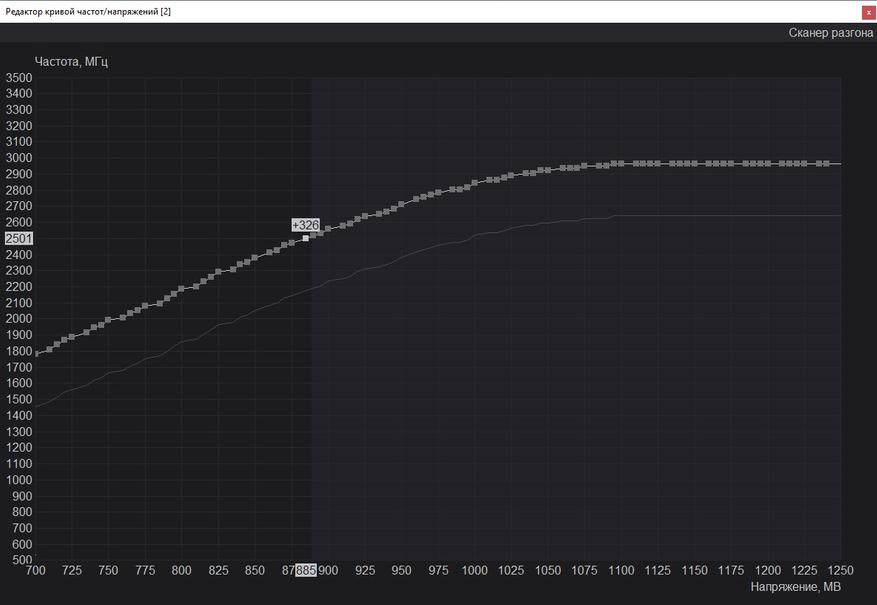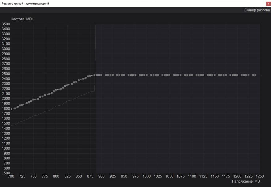 Вторым номером идёт снижение напряжения видеокарты при помощи MSI Afterburner. Прямого доступа к напряжению я не получил, но вышло управлять через кривую. В ходе тестов я мониторил частоту и напряжение, которые достигали 2500 МГц и 1.00 В. Соответственно, я буду отталкиваться от этих значения обнаглев и обрушив напряжение сразу до 0.80 В и зафиксировав частоту 2500 МГц. Наглость сразу была наказана вылетами в играх и добился я стабильности при напряжении 0.89 В и 2490 МГц соответственно. Пройдя все тесты и не встретил проблем в игре.