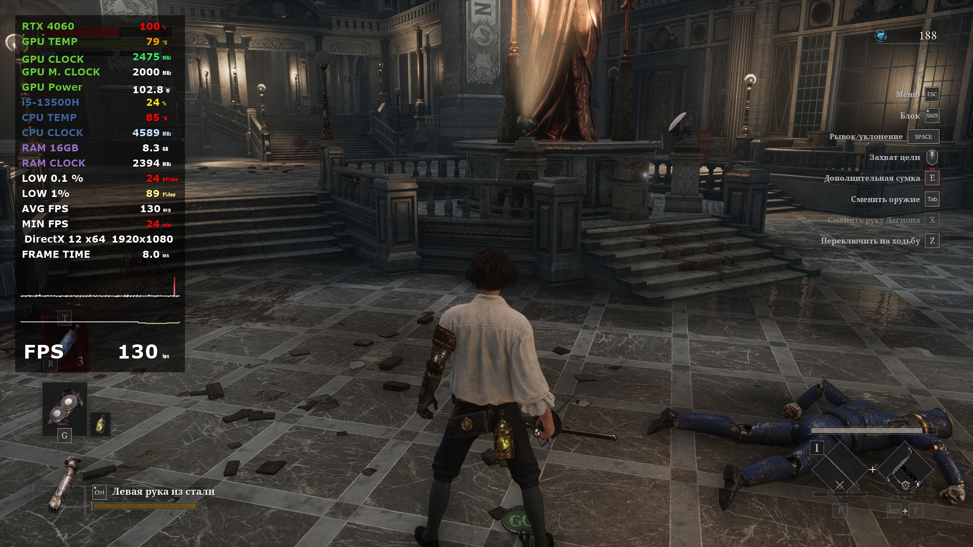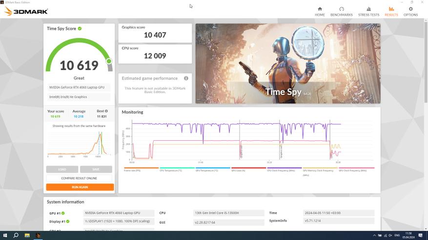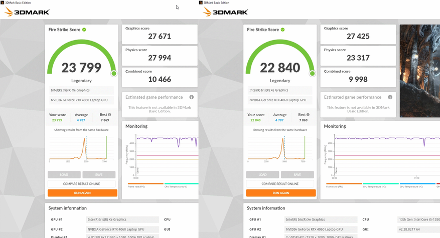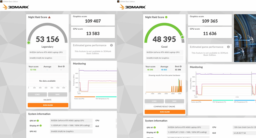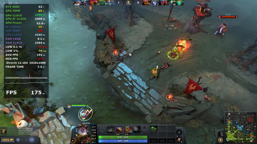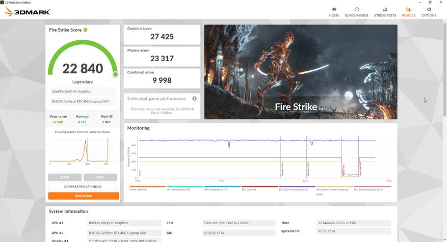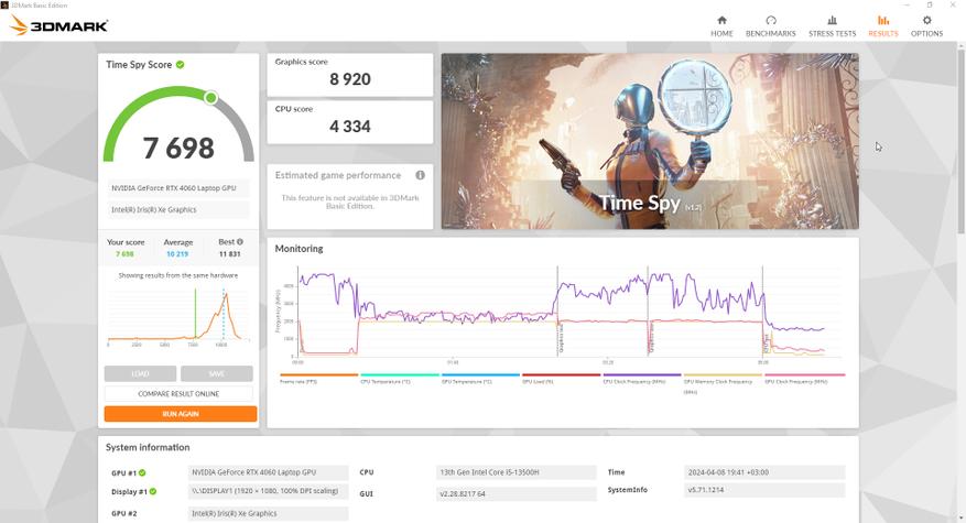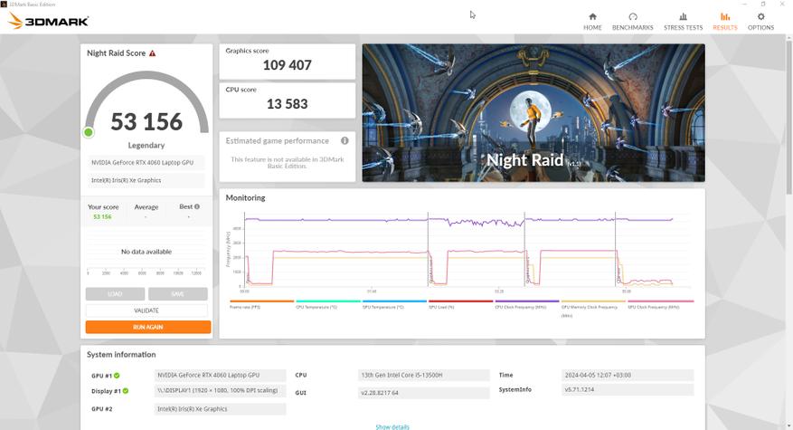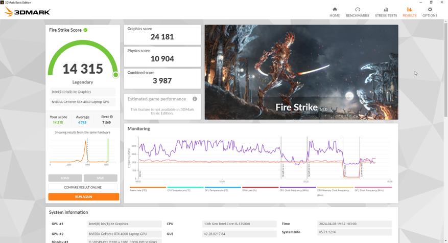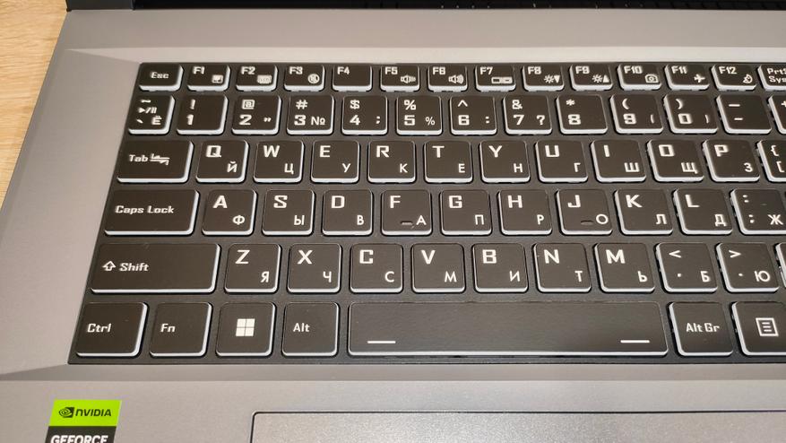 За обработку графики и как по итогу за результаты тестов в играх отвечает Nvidia RTX 4060 с 8 ГБ собственной памяти, а ядро работает на частоте до 2,5 ГГц. Она уже знакома опять же по предыдущему ноутбуку компании, но тогда она работала в связке Core i7-13700H. В этот раз процессор на уровень ниже и от того интересно, как повлияет этот момент, тем более, разрешение экрана то же самое. Отличается и память, теперь это DDR5, но с частотой 4800 МГц, которая очень близка по производительности к DDR4 3200 в L15.