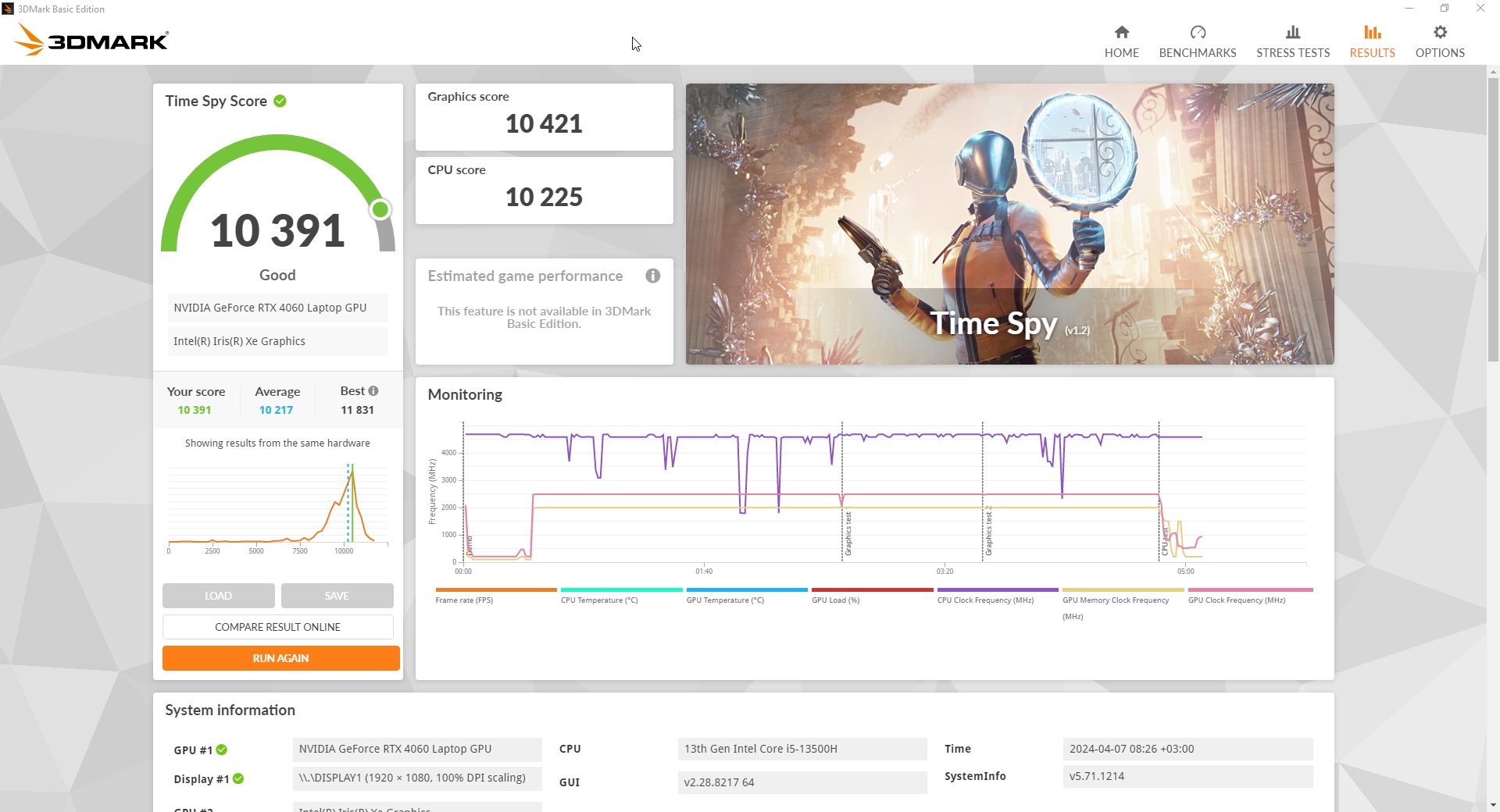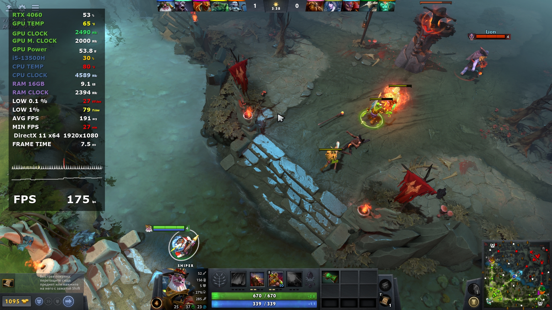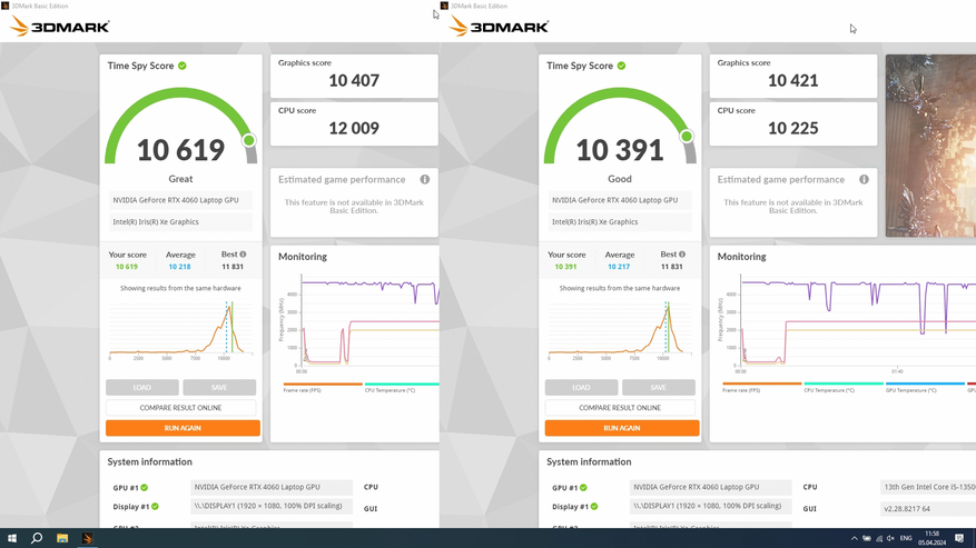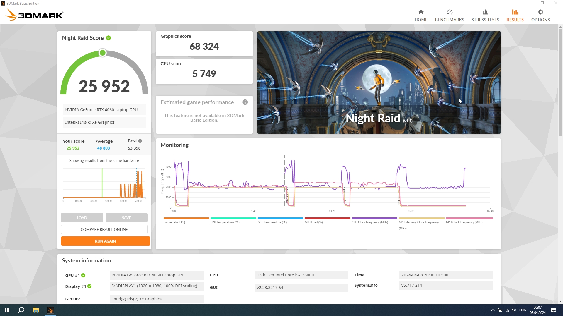 За обработку графики и как по итогу за результаты тестов в играх отвечает Nvidia RTX 4060 с 8 ГБ собственной памяти, а ядро работает на частоте до 2,5 ГГц. Она уже знакома опять же по предыдущему ноутбуку компании, но тогда она работала в связке Core i7-13700H. В этот раз процессор на уровень ниже и от того интересно, как повлияет этот момент, тем более, разрешение экрана то же самое. Отличается и память, теперь это DDR5, но с частотой 4800 МГц, которая очень близка по производительности к DDR4 3200 в L15.