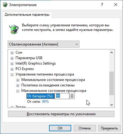 Первым номером будет простейший совет по выставлению 95-99% в электропитании на параметре «максимальное состояние процессора» это позволит не часто использовать турбо, либо вообще отказаться от него. В случае видеокарты RTX 4060, я считаю оправданным, т.к. обычно процессор загружен был на 30-50% в то время, как видеокарта держалась на 99-100%, кроме, наверное CS2.