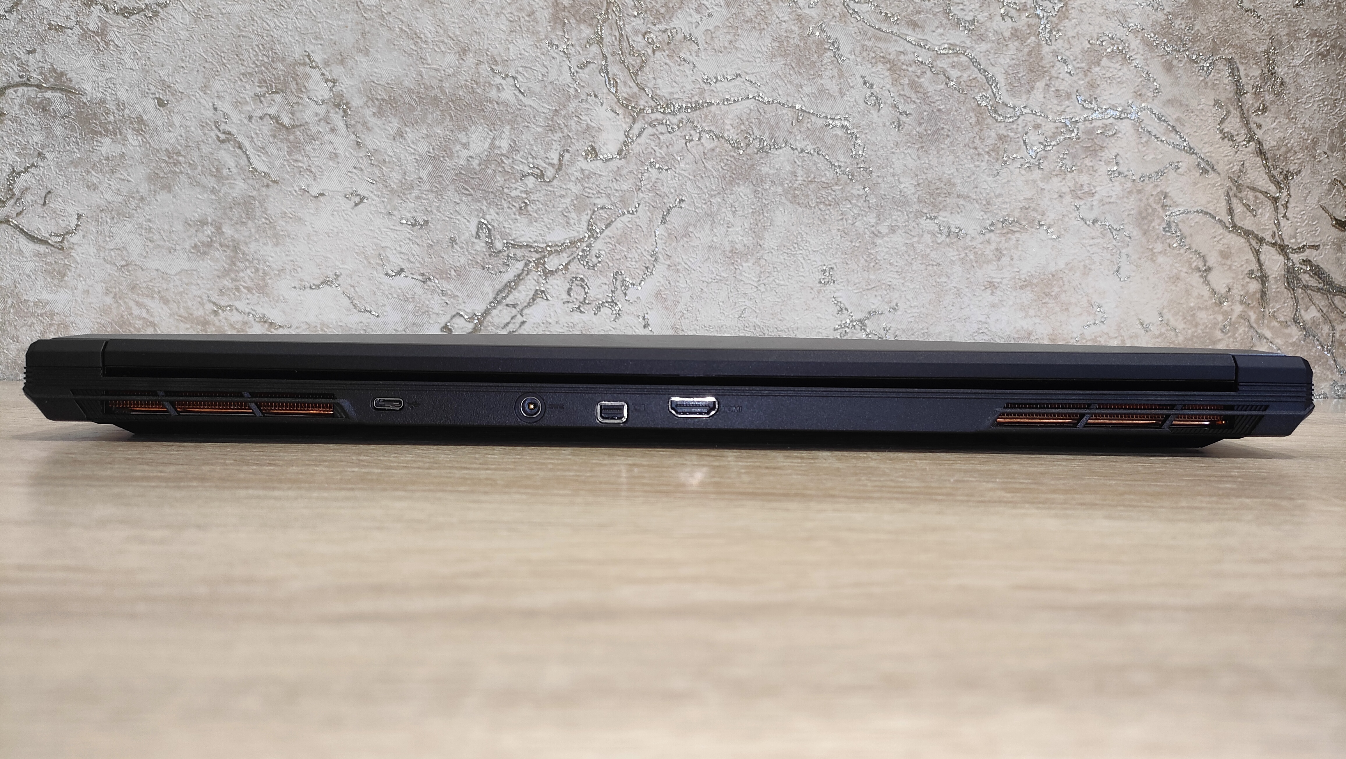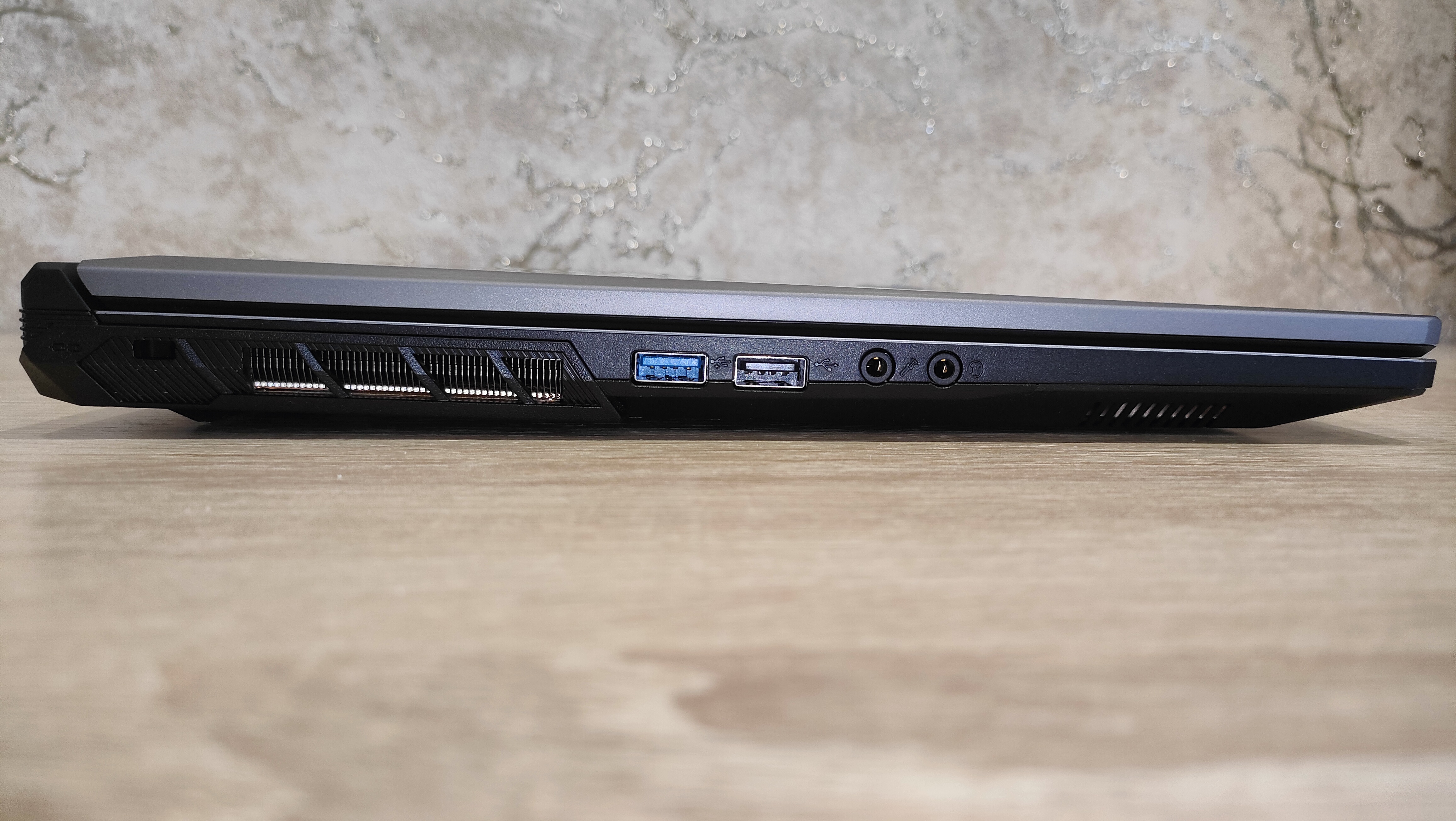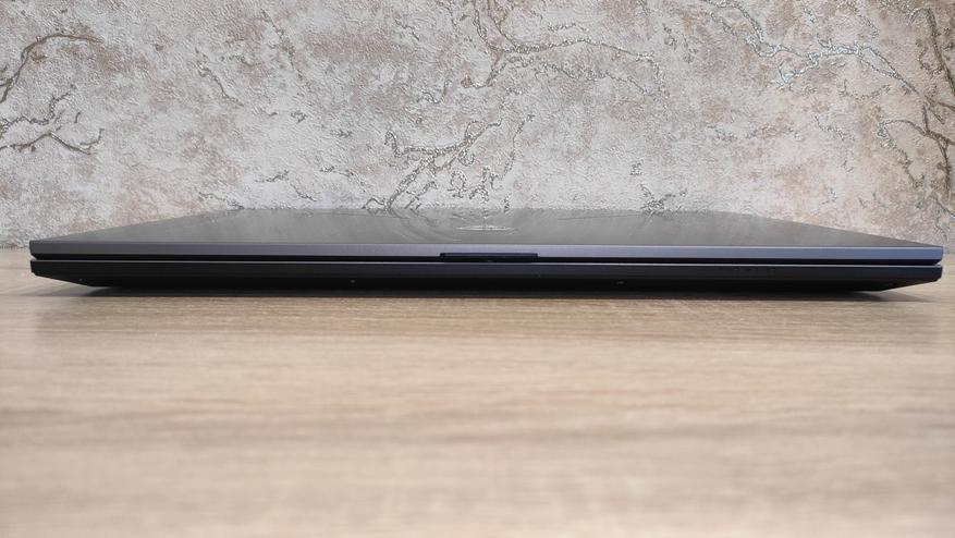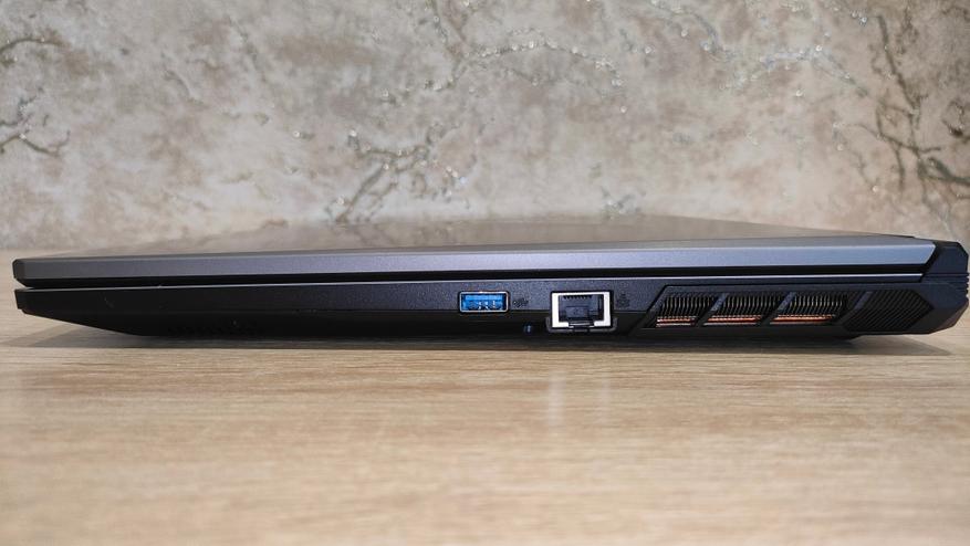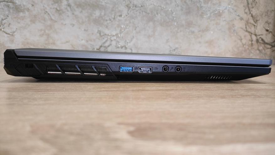 Спереди есть выемка для удобного открытия, а также видны индикаторы. Слева раздельные 3,5 мм разъемы для микрофона и наушников, а также пара USB A разных ревизий в виде 2.0 и 3.2 Gen2. Тыл не лишён портов, как большинство неигровых моделей, на нем есть HDMI, miniDP, цилиндрический разъем питания, а также USB C 3.2 Gen2. Справа есть также USB C 3.2 Gen2, добивающий общее количество универсальных портов до четырех, рядом есть картовод для MicroSD и проводная сеть.