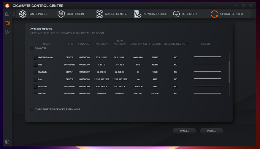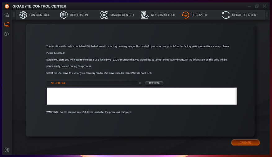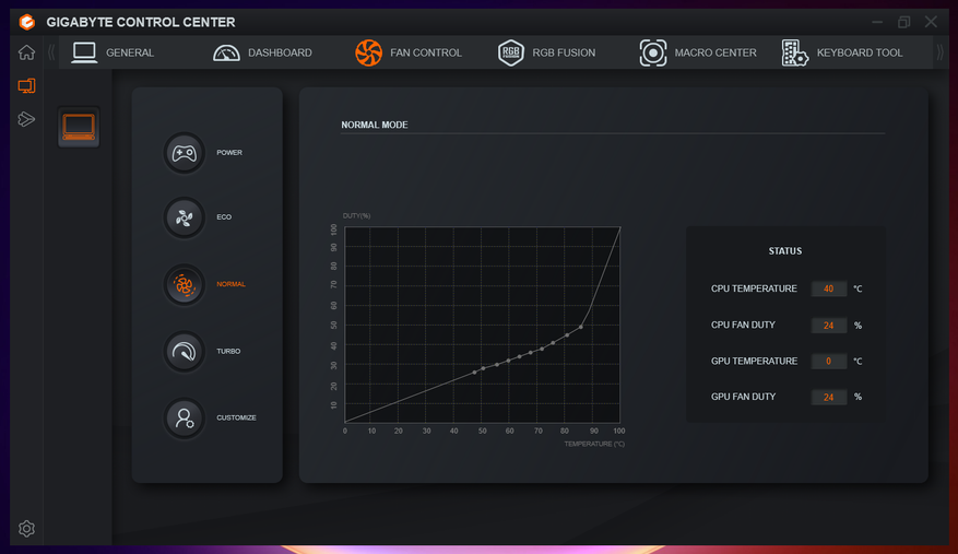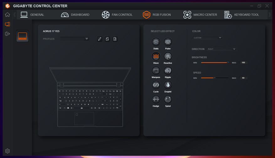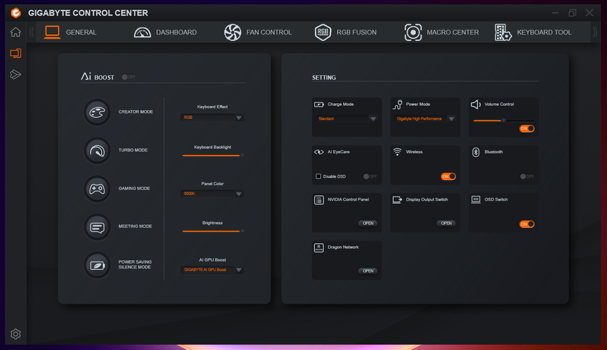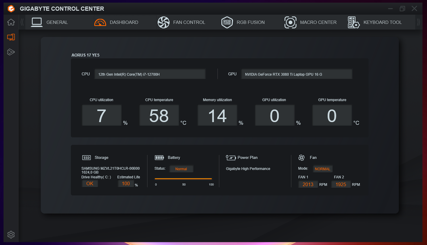 Не уделить внимания фирменному программному обеспечению было нельзя. Это совершенно новая разработка производителя, которая, в сравнении с предшествующей версией, работает куда стабильнее. Поменялся также и дизайн. Функционал тоже был расширен. Доступны возможности: выбора профиля производительности, изменения ключевых настроек ноутбука, мониторинг системы, управление системой охлаждения, настройка подсветки и функций клавиатуры, создание макросов, возможность создать съёмный накопитель для восстановления системы, а также возможность обновить драйверы компонентов и ПО ноутбука.