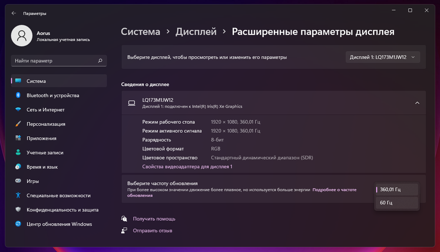 Как уже было сказано, все модификации AORUS 17 текущего поколения поставляются с FullHD IPS экранами с частотой обновления 360 Гц. Промежуточных значений между 60 Гц и 360 Гц нет.